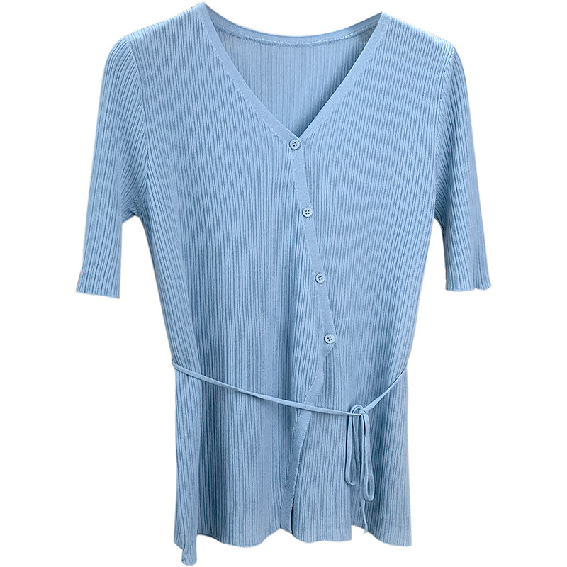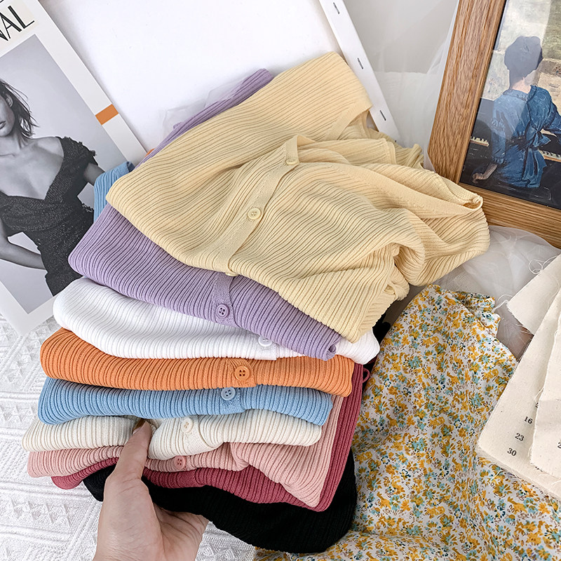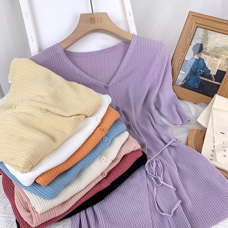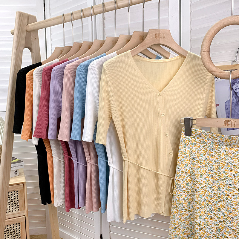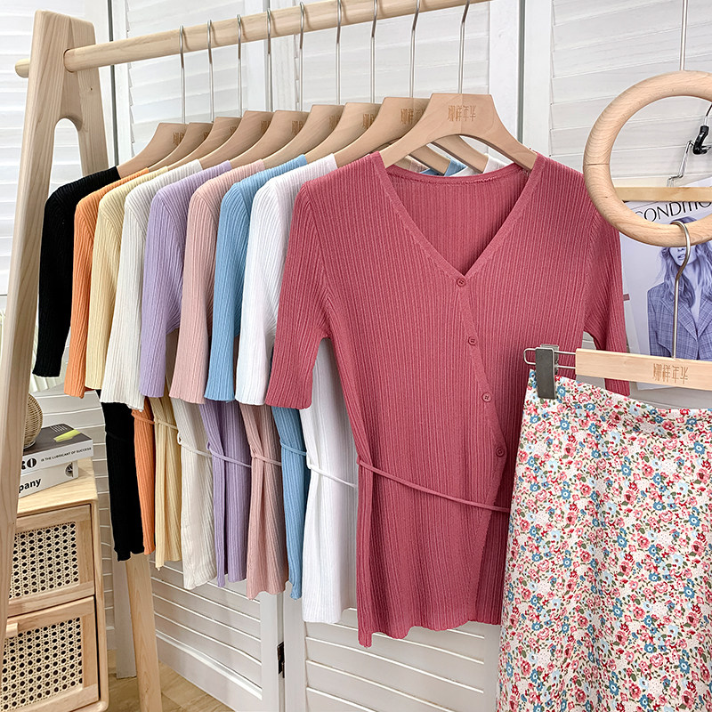 Трикотажный летний свитер, тонкий кардиган, в корейском стиле, V-образный вырез, короткий рукав, с рукавом, в западном стиле