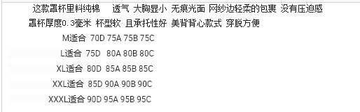 | Размер: | Подходит M (70D 75A 75B 75C), L подходит (75D 80A 80B 80C), Размер XL подходит (80D 85A 85B 85C), Размер XXL подходит (85D 90A 90B 90C), XXXL подходит (90D 95A 95B 95C) |