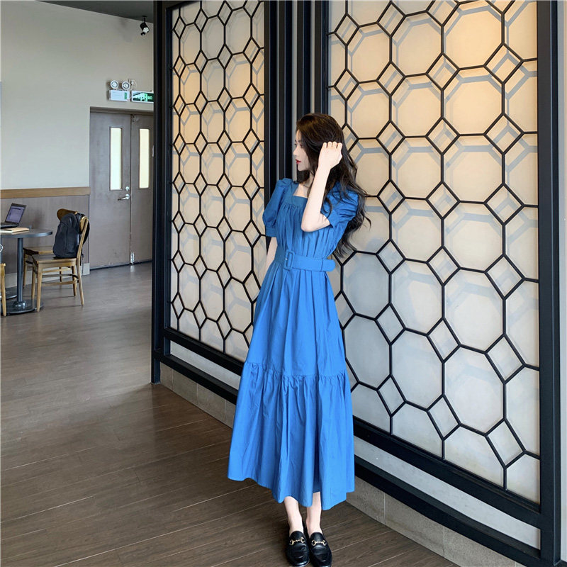 Синее брендовое платье, длинная юбка, корсет, французский стиль, квадратный вырез