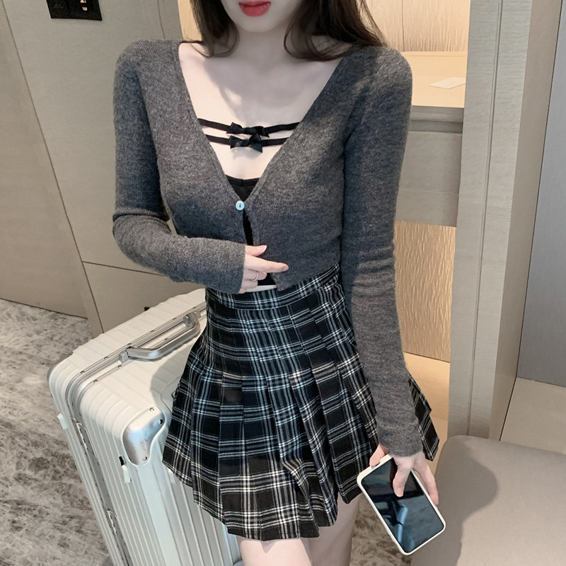 Сексуальная приталенная юбка, черная майка, трикотажный топ с чашечками, кардиган, высокая талия