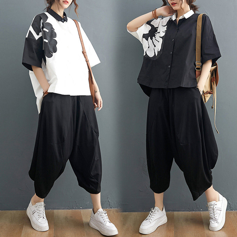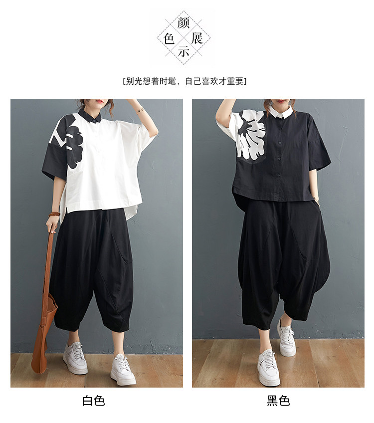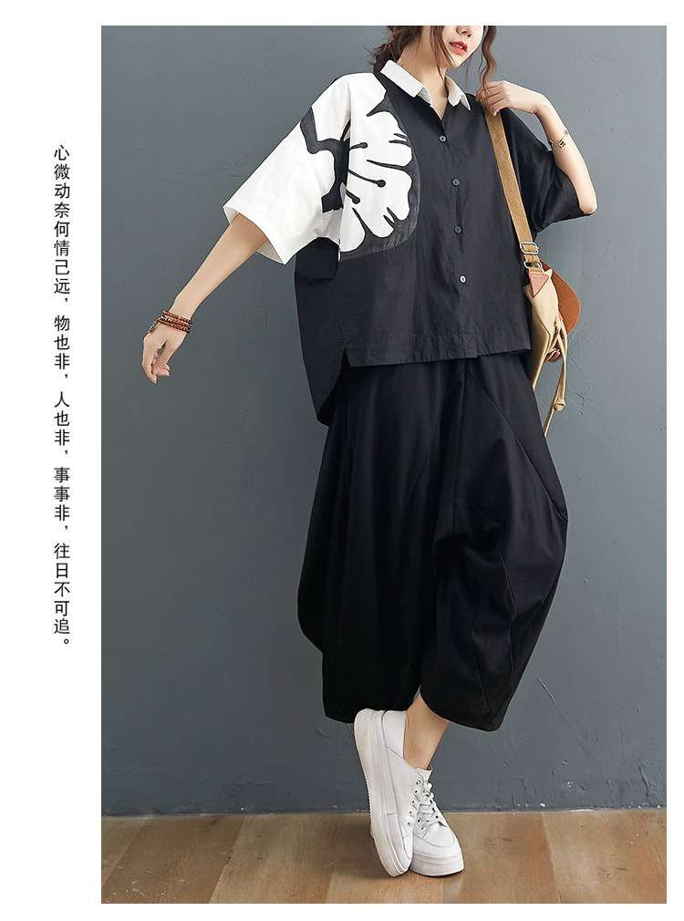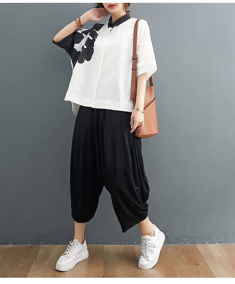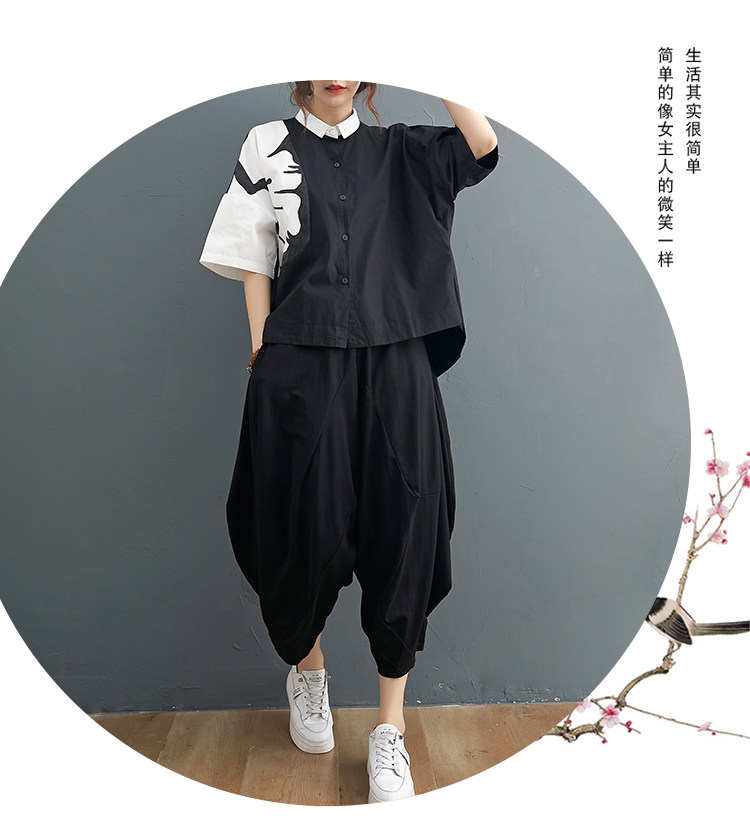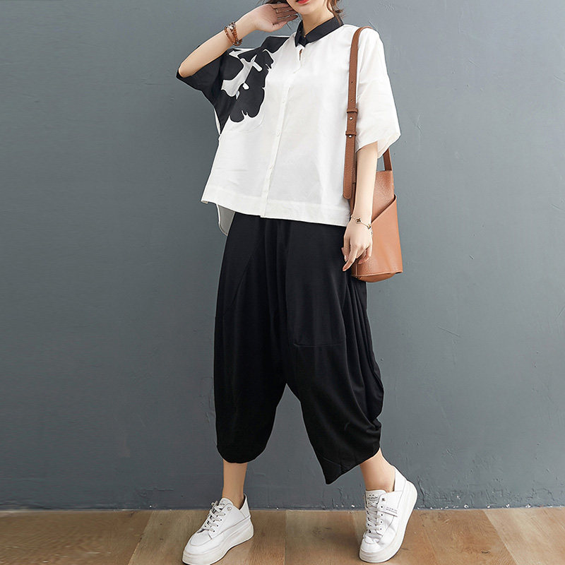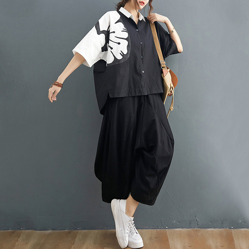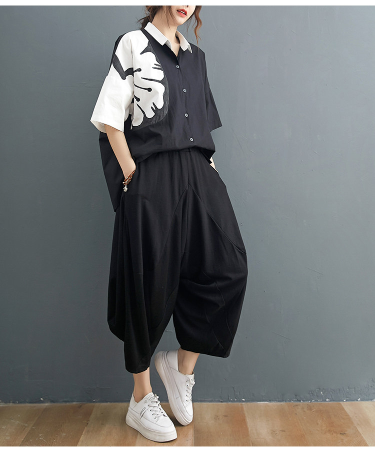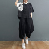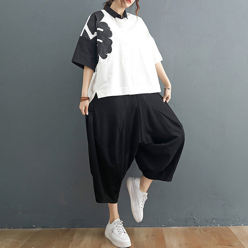 Комплект, рубашка для отдыха, штаны, из хлопка и льна, короткий рукав, эластичная талия, свободный крой
