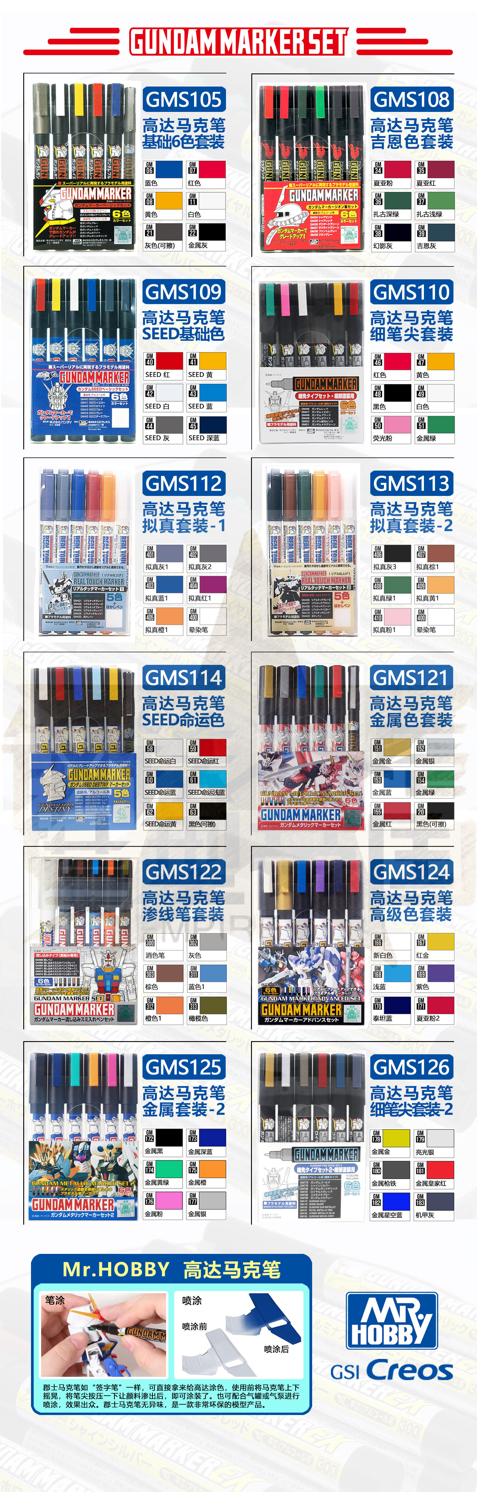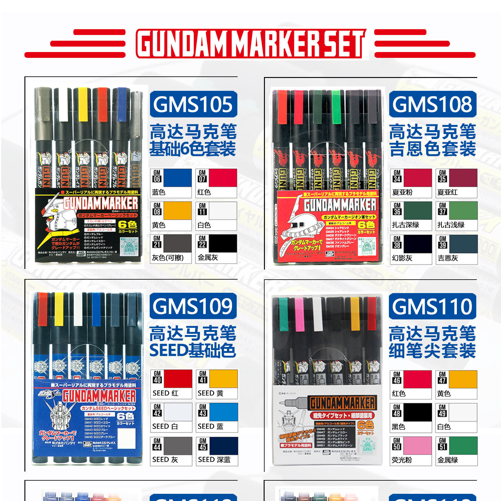 | Цвет: | GMS-100 SD Three Kingdoms Gundam Set, GMS-105 базовый цвет Gundam набор Gundam, Gms-108 geen color set, GMS-109 базовые набор цветовых наборов, GMS-110 Pen Pen Set 1, Федерация GMS112 намеревается, GMS113 Джен, предполагаемый старый химический набор, GMS114 SEDINY SEED SET, GMS121 Металлический набор 1, GMS122 Осмотическая рукава ручек, GMS124 Advanced Color Set, GMS125 Металлический цветовой набор 2, GMS126 Fine Pen Tip Set 2 |