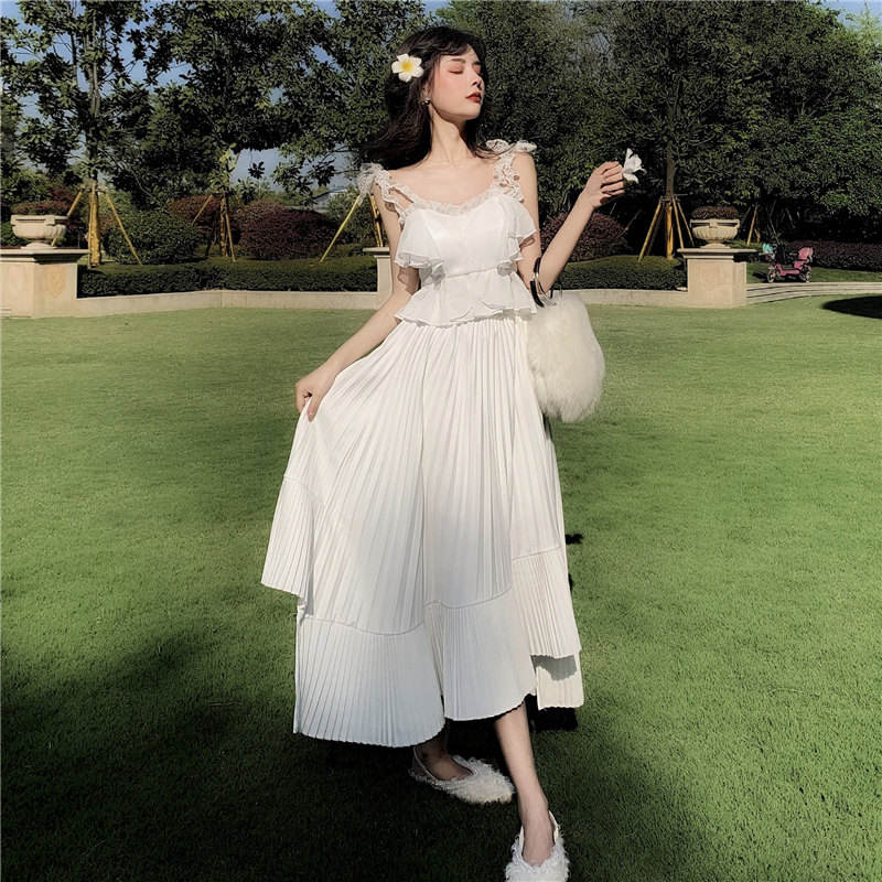 Летнее длинное белое платье, шифоновая юбка в складку, платье-комбинация, 2021 года, средней длины
