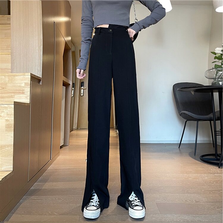Костюм, весенние черные штаны, высокая талия, большой размер, по фигуре, свободный прямой крой