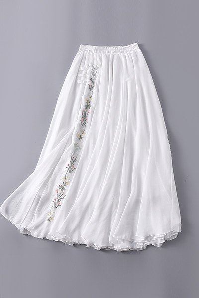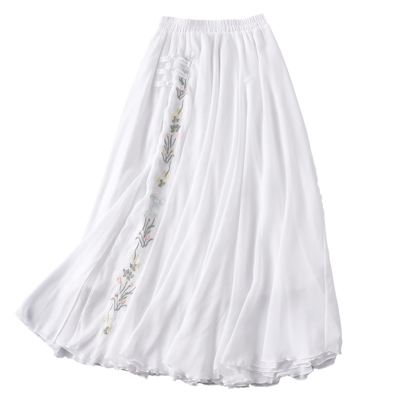 Шифоновая ретро длинная белая юбка, китайский стиль, с вышивкой