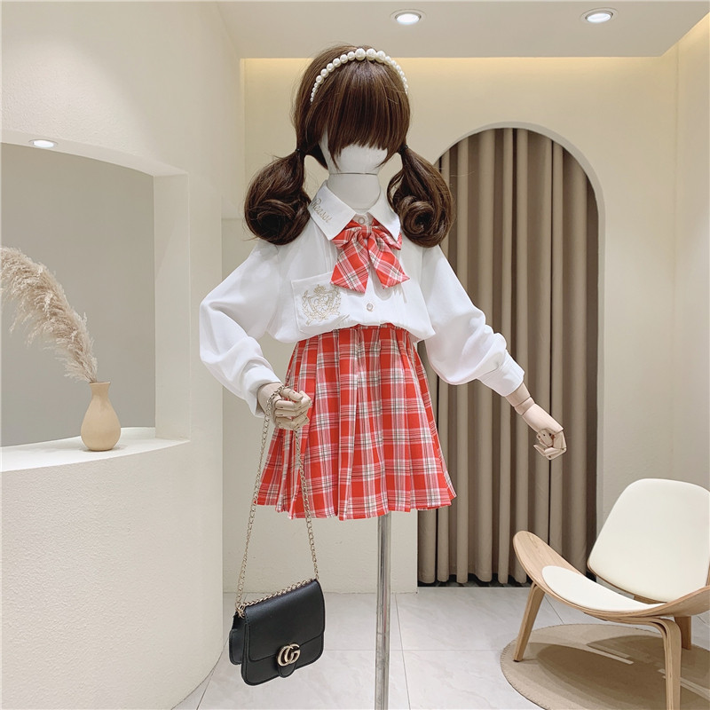 Студенческая юбка в складку, галстук-бабочка, рубашка, комплект, детская одежда, коллекция 2021, с вышивкой