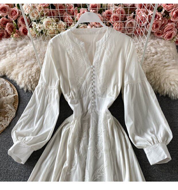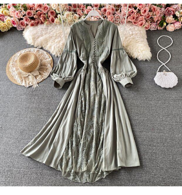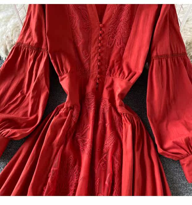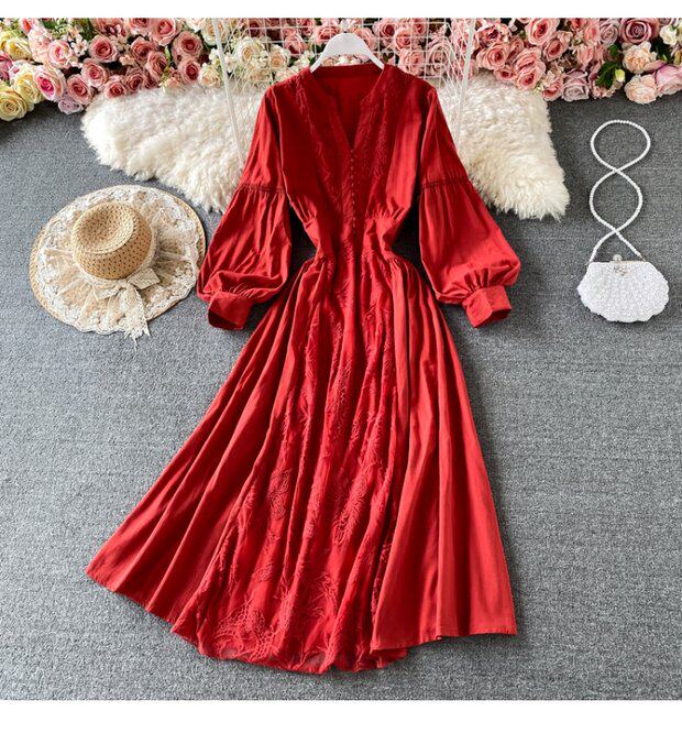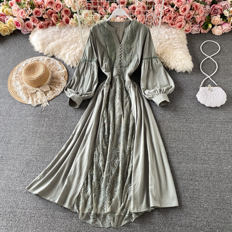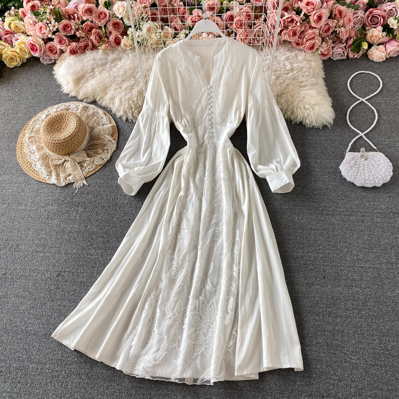 Корсет, фонарь, элегантное платье, длинная юбка, в корейском стиле, V-образный вырез, с вышивкой