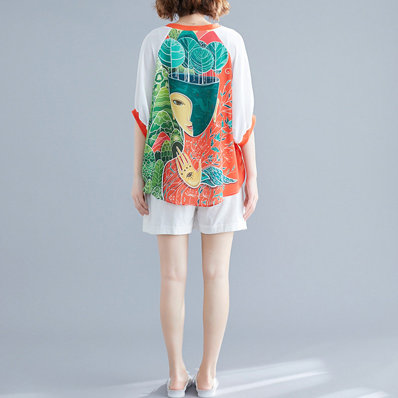 Шифоновая летняя одежда, мультяшная футболка с коротким рукавом, V-образный вырез, в западном стиле, по фигуре