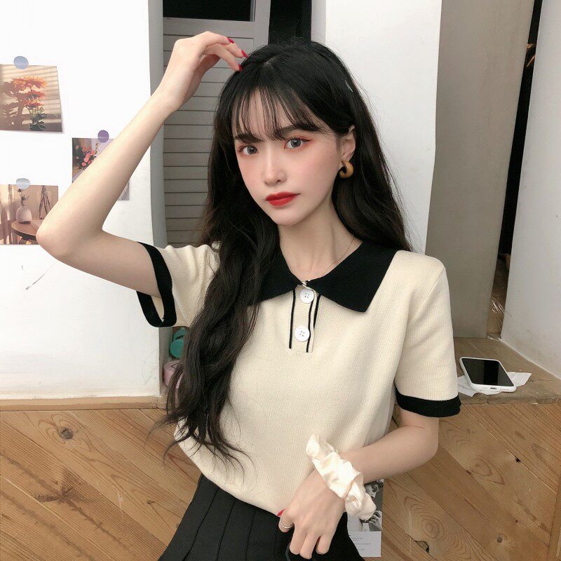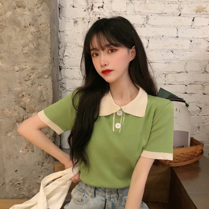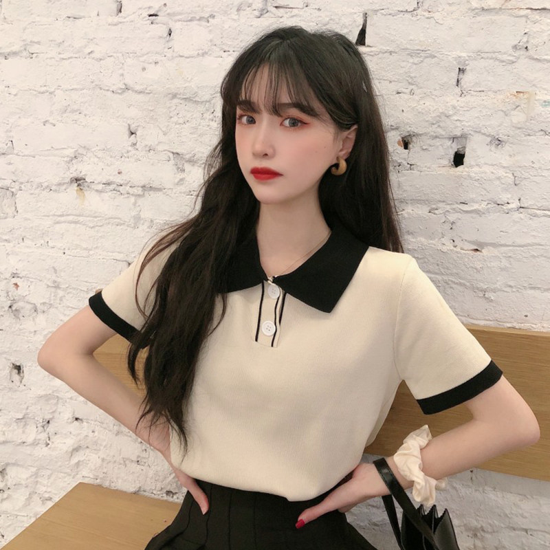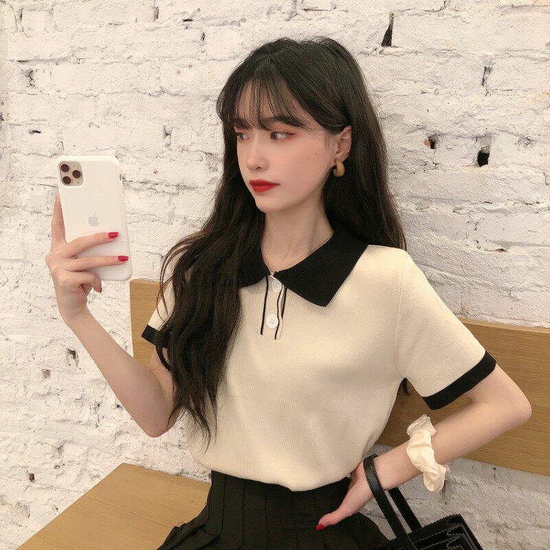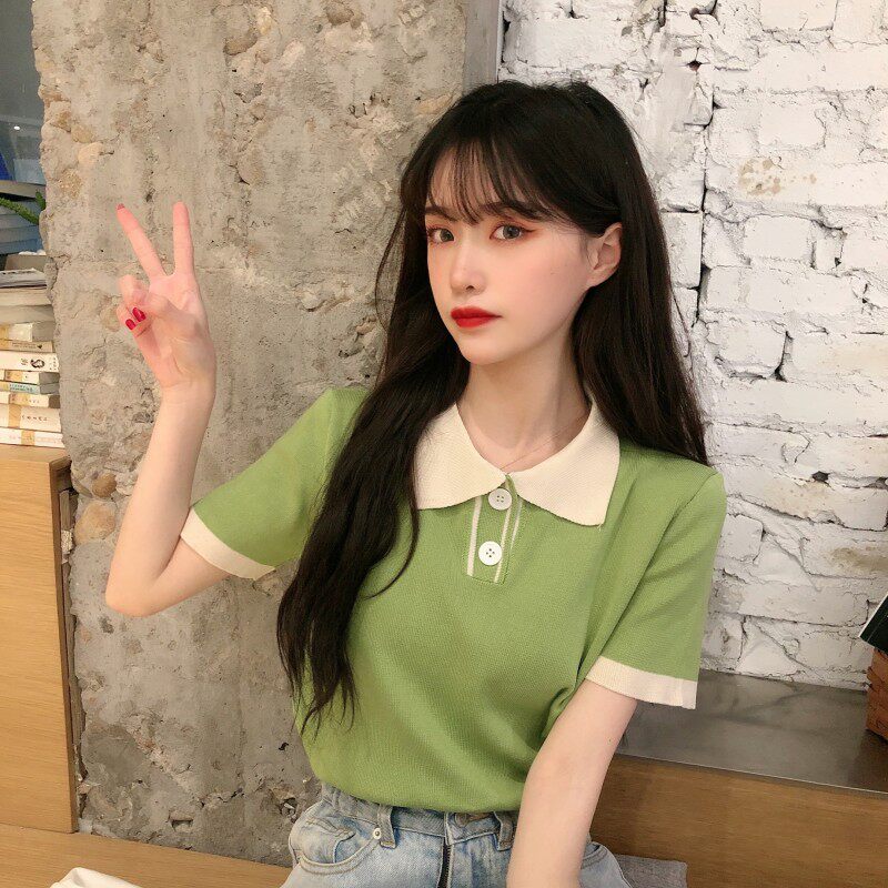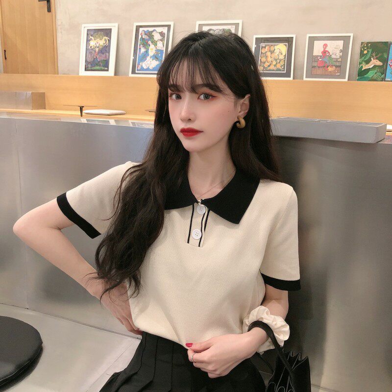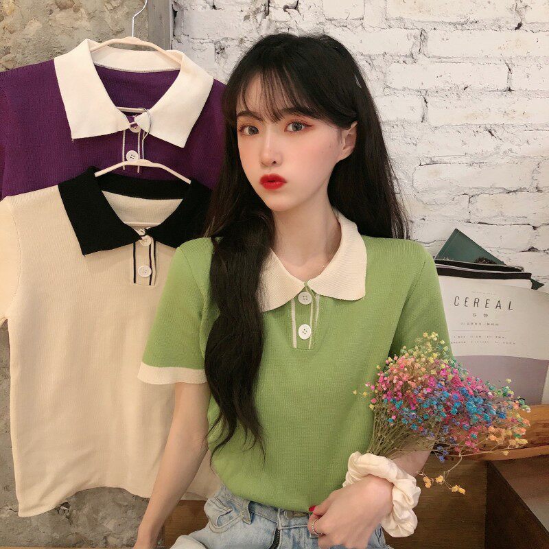 Летний трикотажный свитер, короткая футболка с коротким рукавом, коллекция 2021, воротник поло, короткий рукав