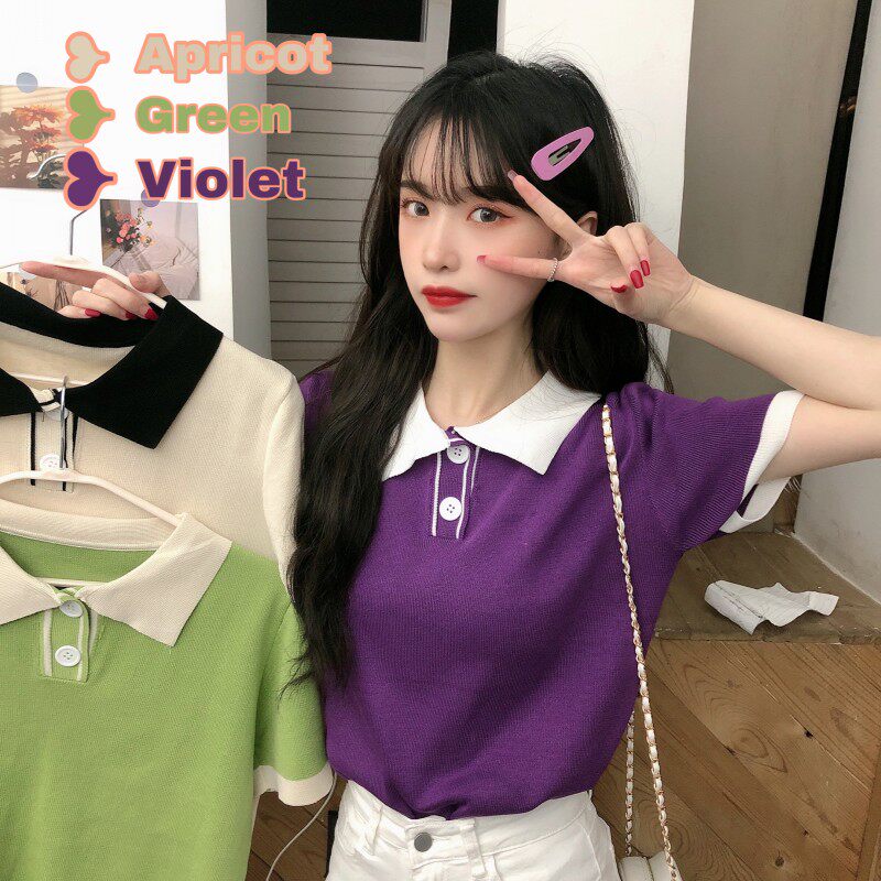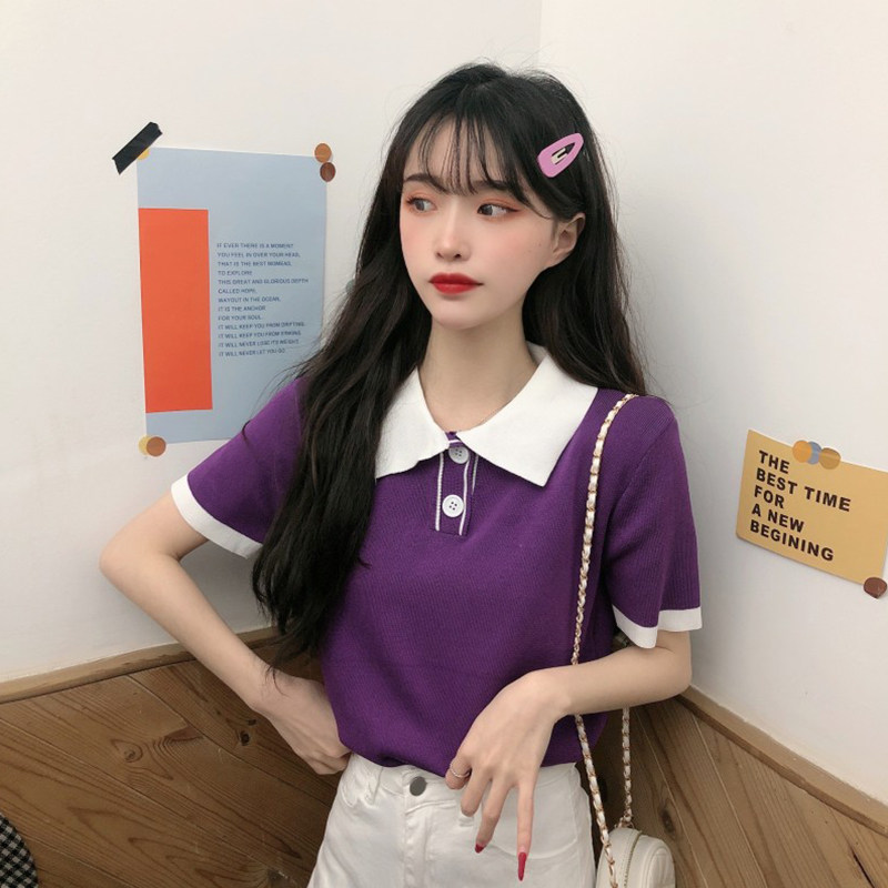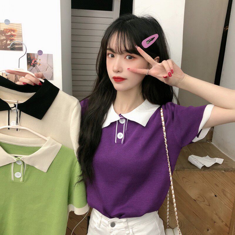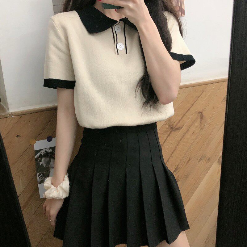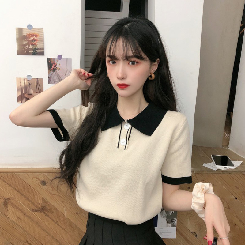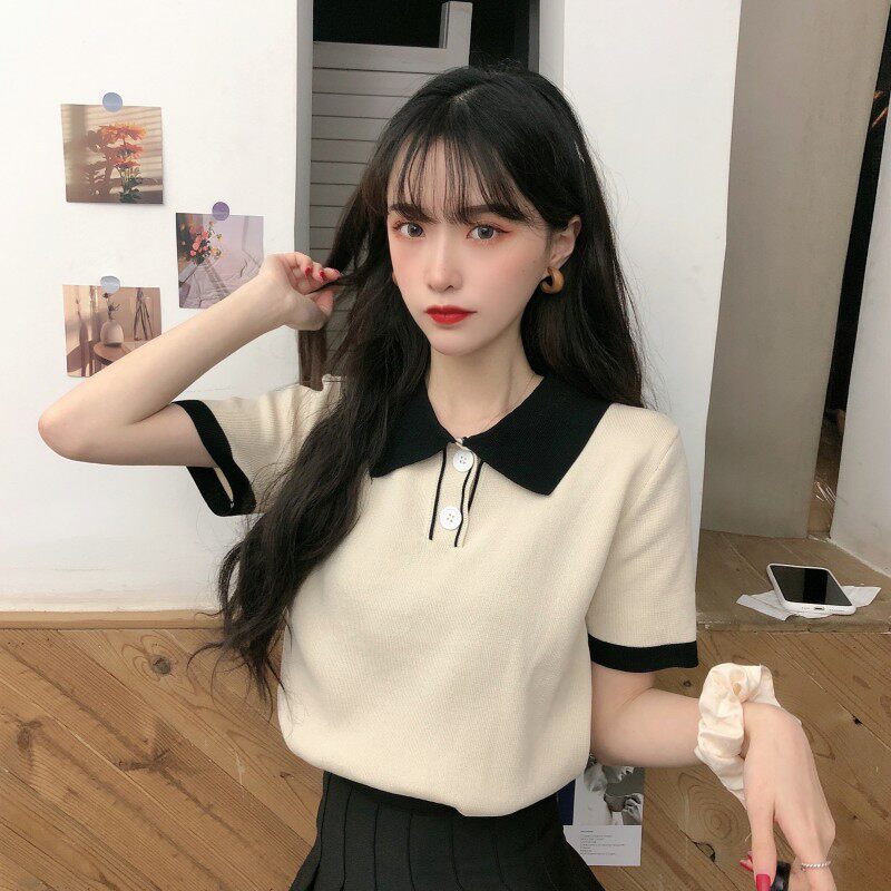 Летний трикотажный свитер, короткая футболка с коротким рукавом, коллекция 2021, воротник поло, короткий рукав