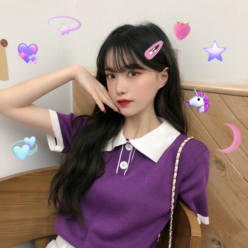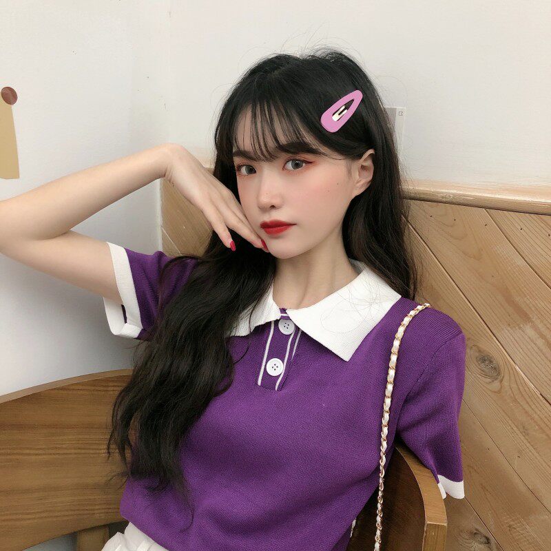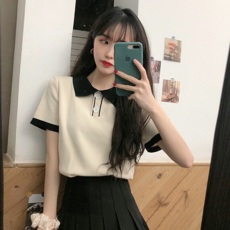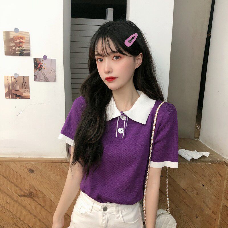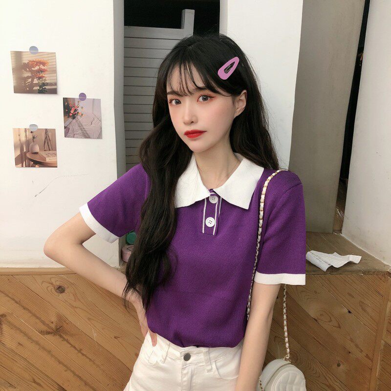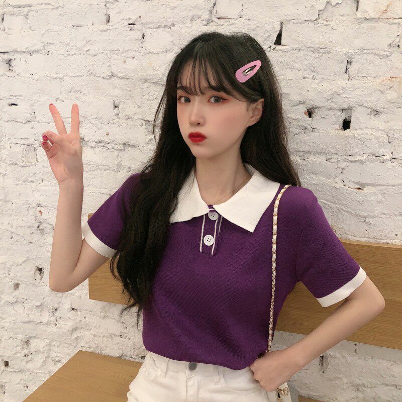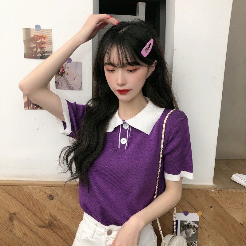 Летний трикотажный свитер, короткая футболка с коротким рукавом, коллекция 2021, воротник поло, короткий рукав