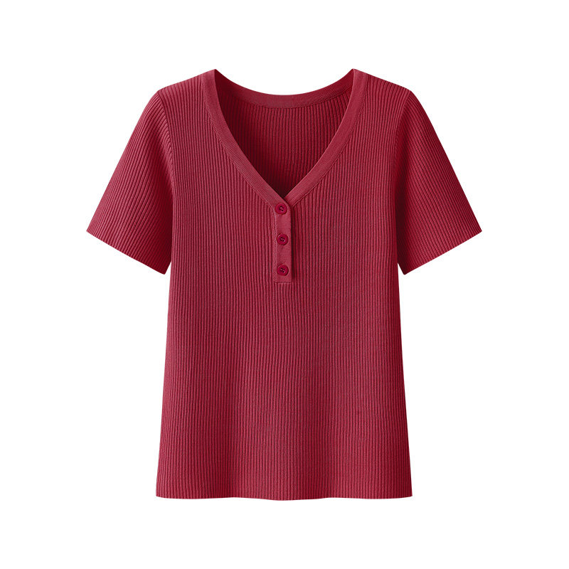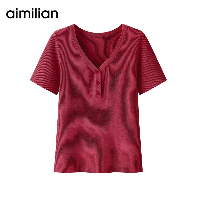 艾米恋 Трикотажный тонкий летний свитер, летняя базовая красная футболка, короткий рукав, V-образный вырез, облегающий крой