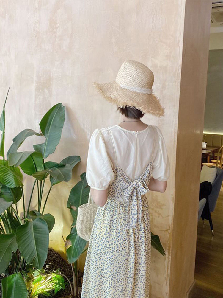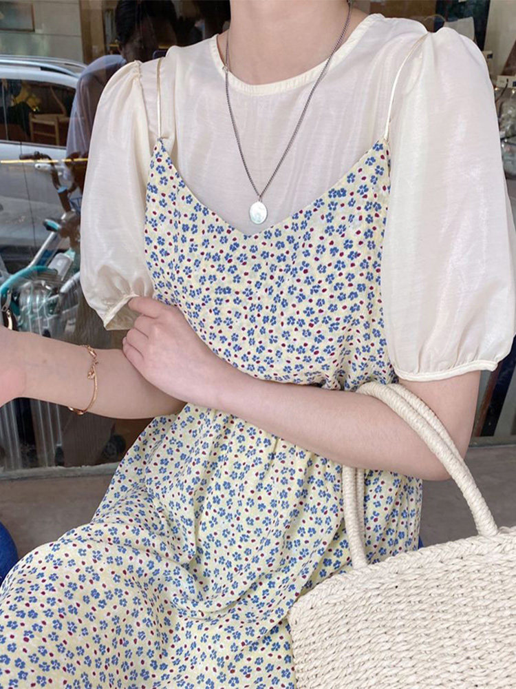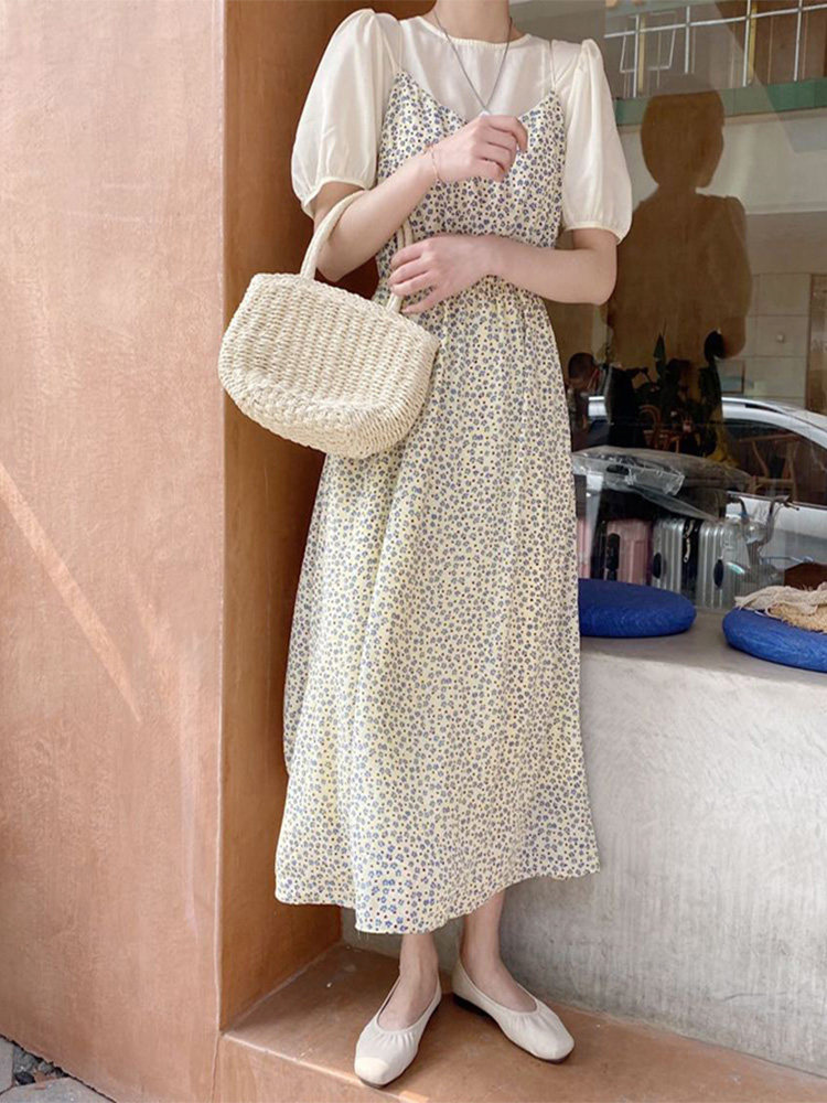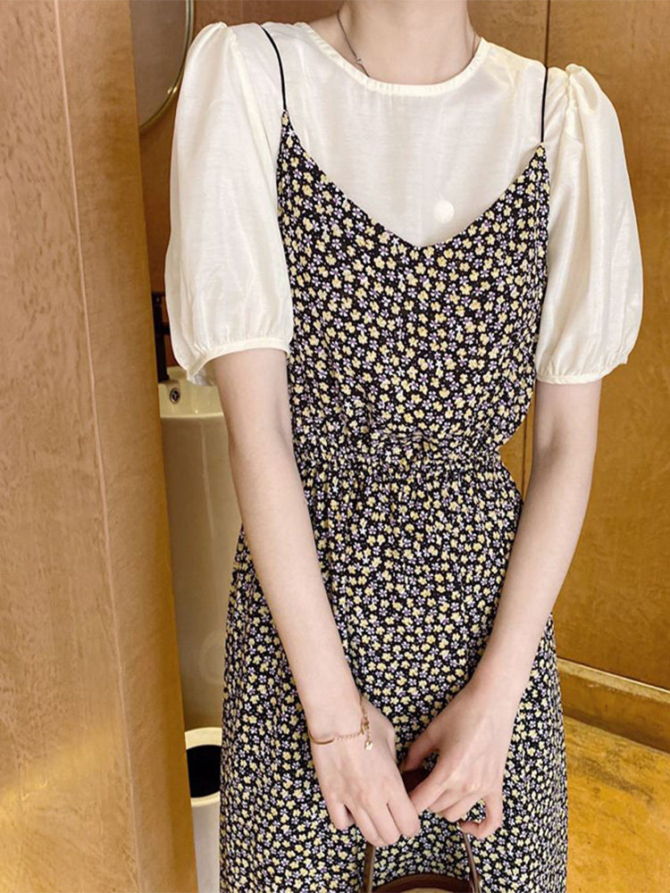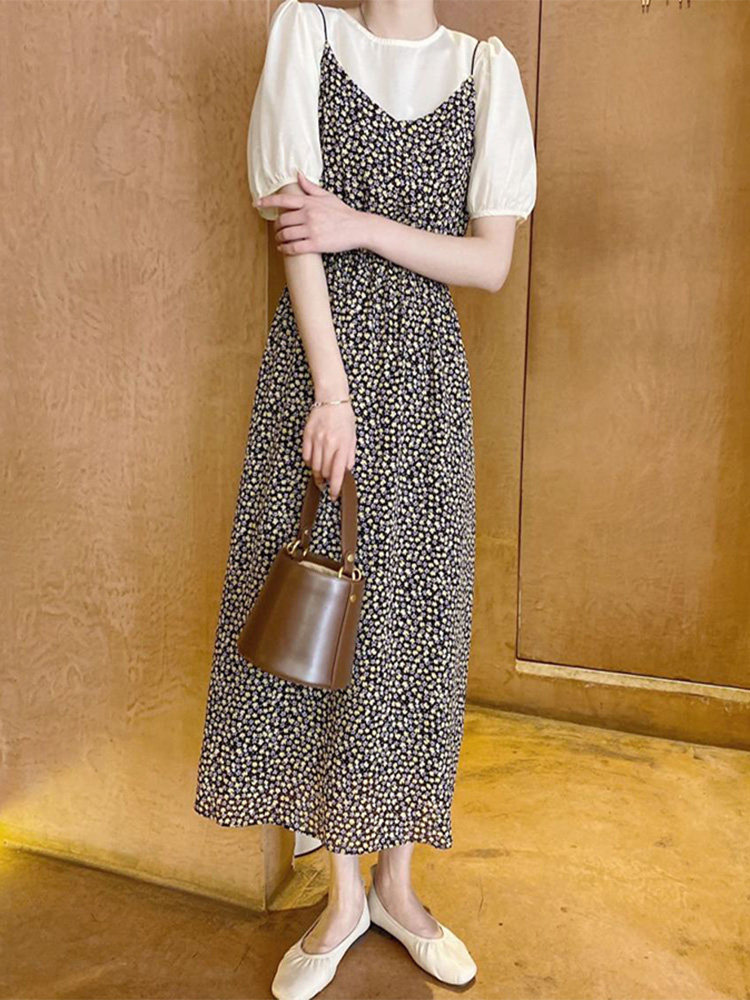 Летнее платье, свежий комплект, подходит для подростков, изысканный стиль, эффект подтяжки, цветочный принт
