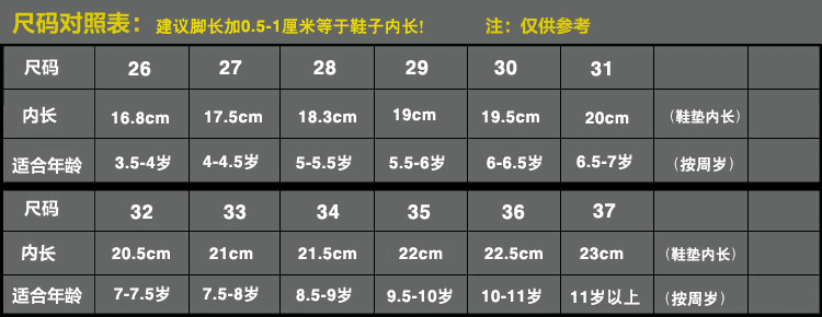 | Размер обуви: | 26 ярдов/180 длина 16,8 см, 27 ярдов/185 длина 17,5 см, 28 ярдов/190 длина 18,3 см., 29 ярдов/195 длина 19 см., 30 ярдов/200 длина 19,5 см, 31 код/205 длина 20 см., 32 ярдов/210 длина 20,5 см, 33 ярда/215 длина 21 см., 34 ярда/220 длина 21,5 см, 35 ярдов/225 в пределах 22 см., 36 ярдов/230 в пределах 22,5 см., 37 ярдов/235 в пределах 23 см., 38 кодов/240 внутренняя длина 23,5 см, 39 кодов/245 внутренняя длина 24 см., 40 кодов/240 внутренней длины 24,5 см |