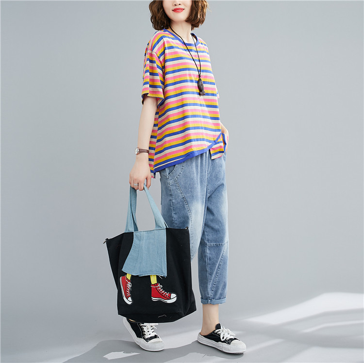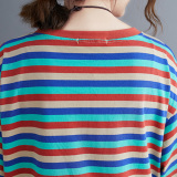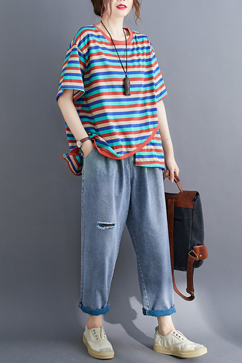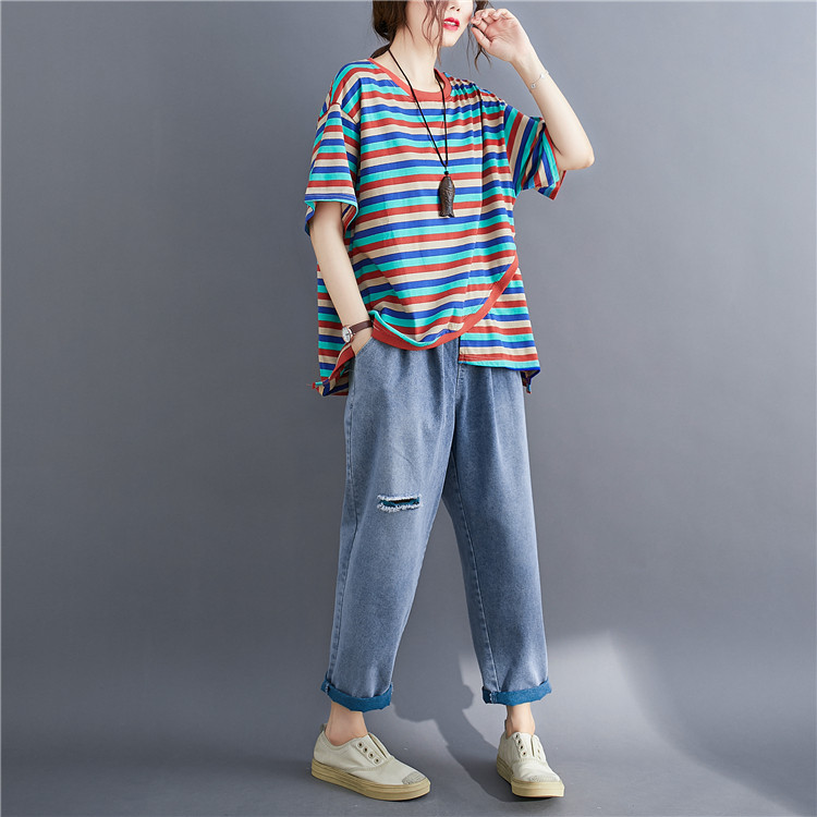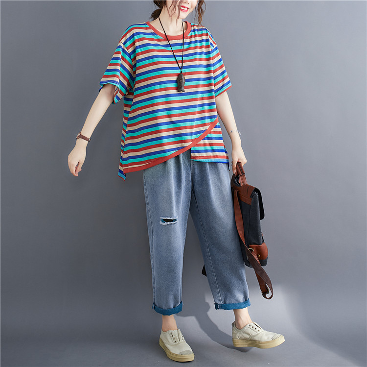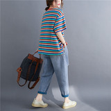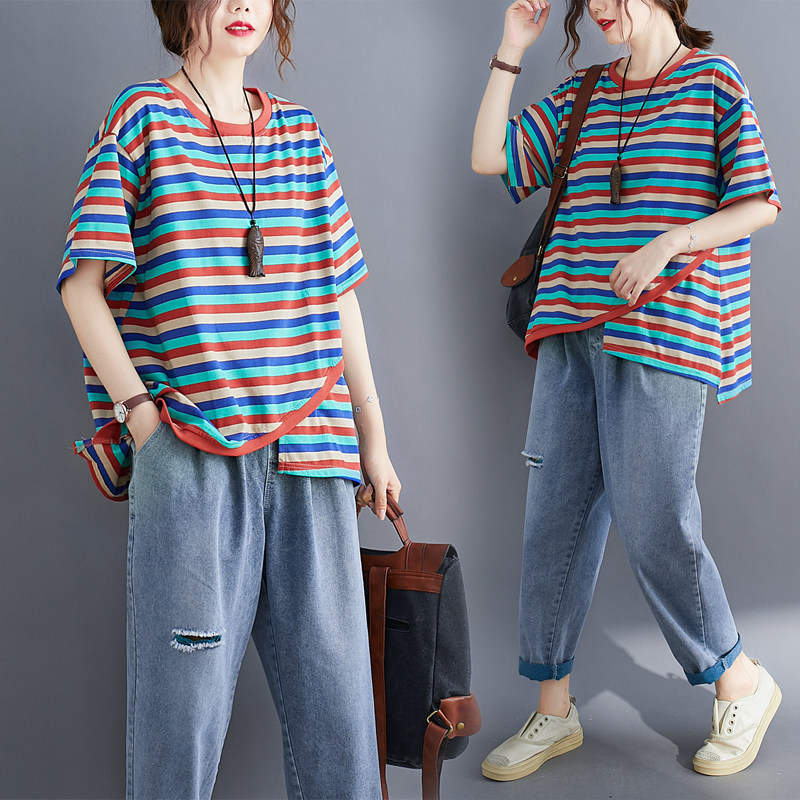 Литературный большой размер случайный и модный слабый тонкий цвет полосатой жирной рубашка MMT Женская круглое летнее топ с короткими рукавами