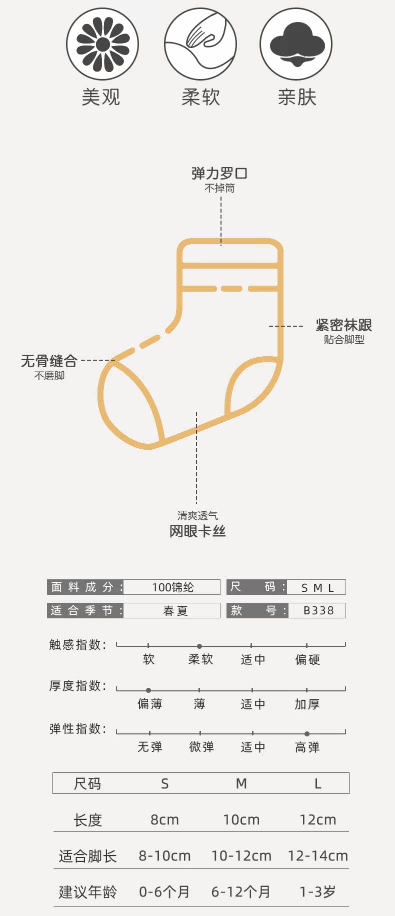 Возрастная категория: S (длина подошвы носков 8 см) 0-6 мес., М (длина носка 10см) 6-12 мес., L (длина носка 12 см) 1-3 года