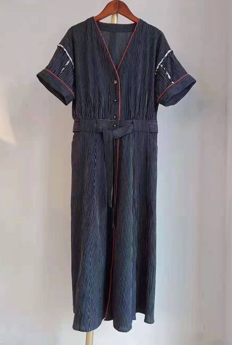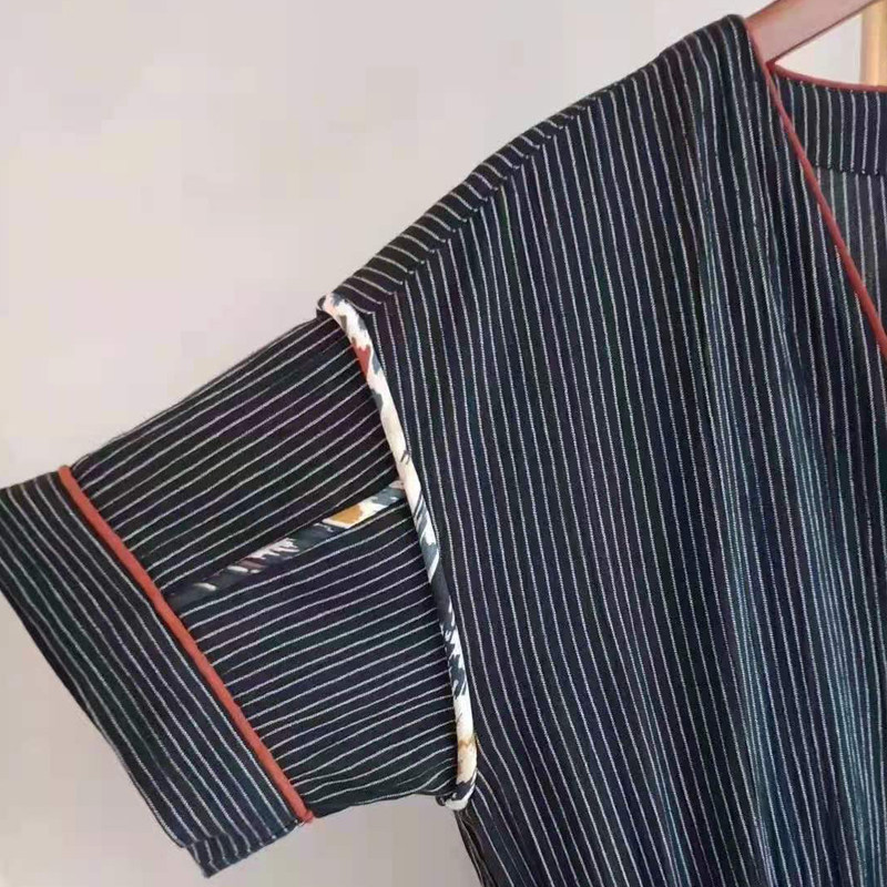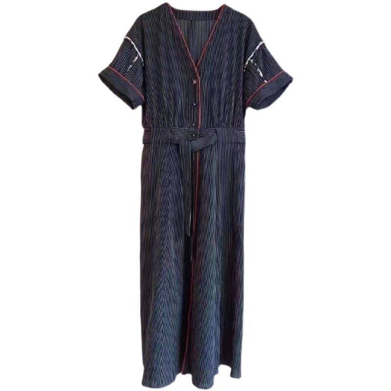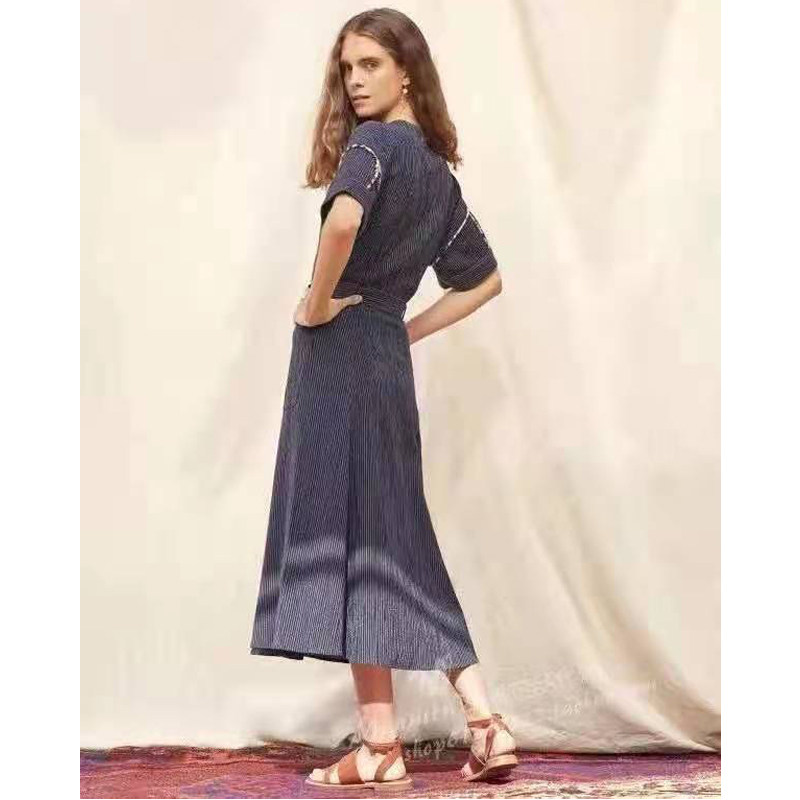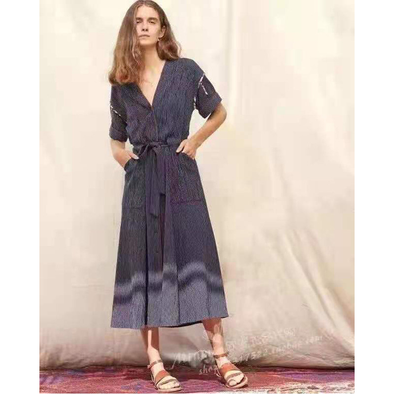 Специальная французская нишевая ретро романтическое романтическое v-образное полосатое инкрустация хлопок плюс шелковое платье с короткими рукавами шелковое плечо 3970