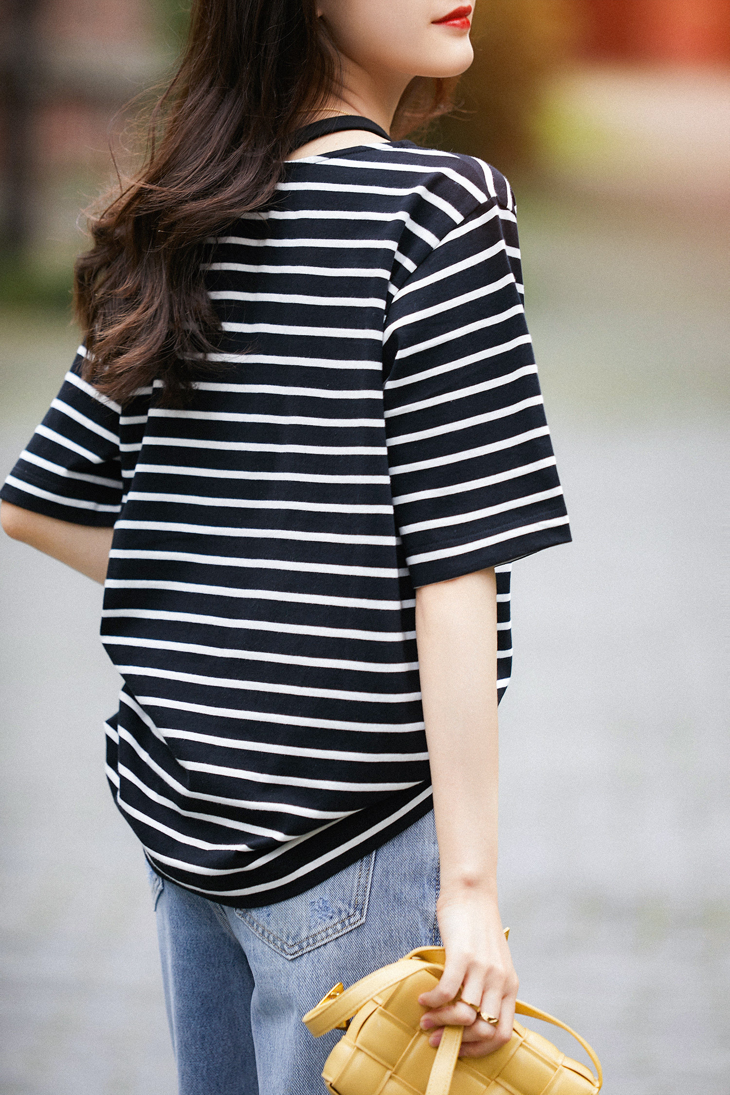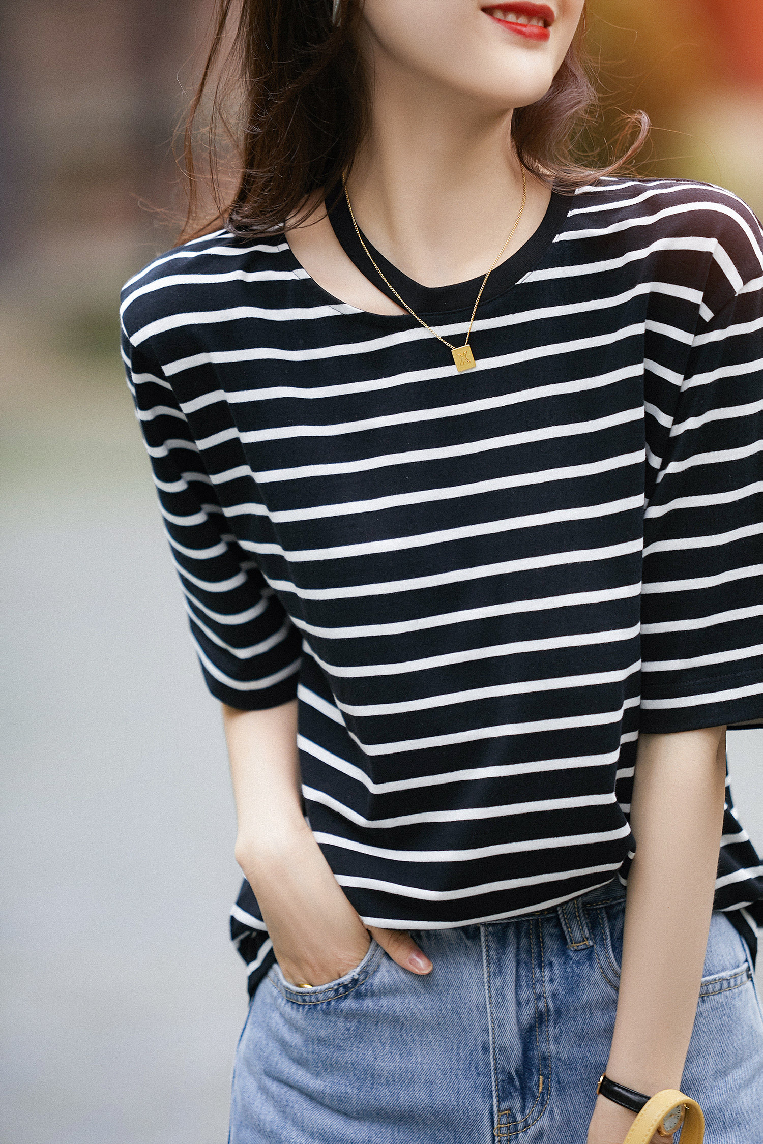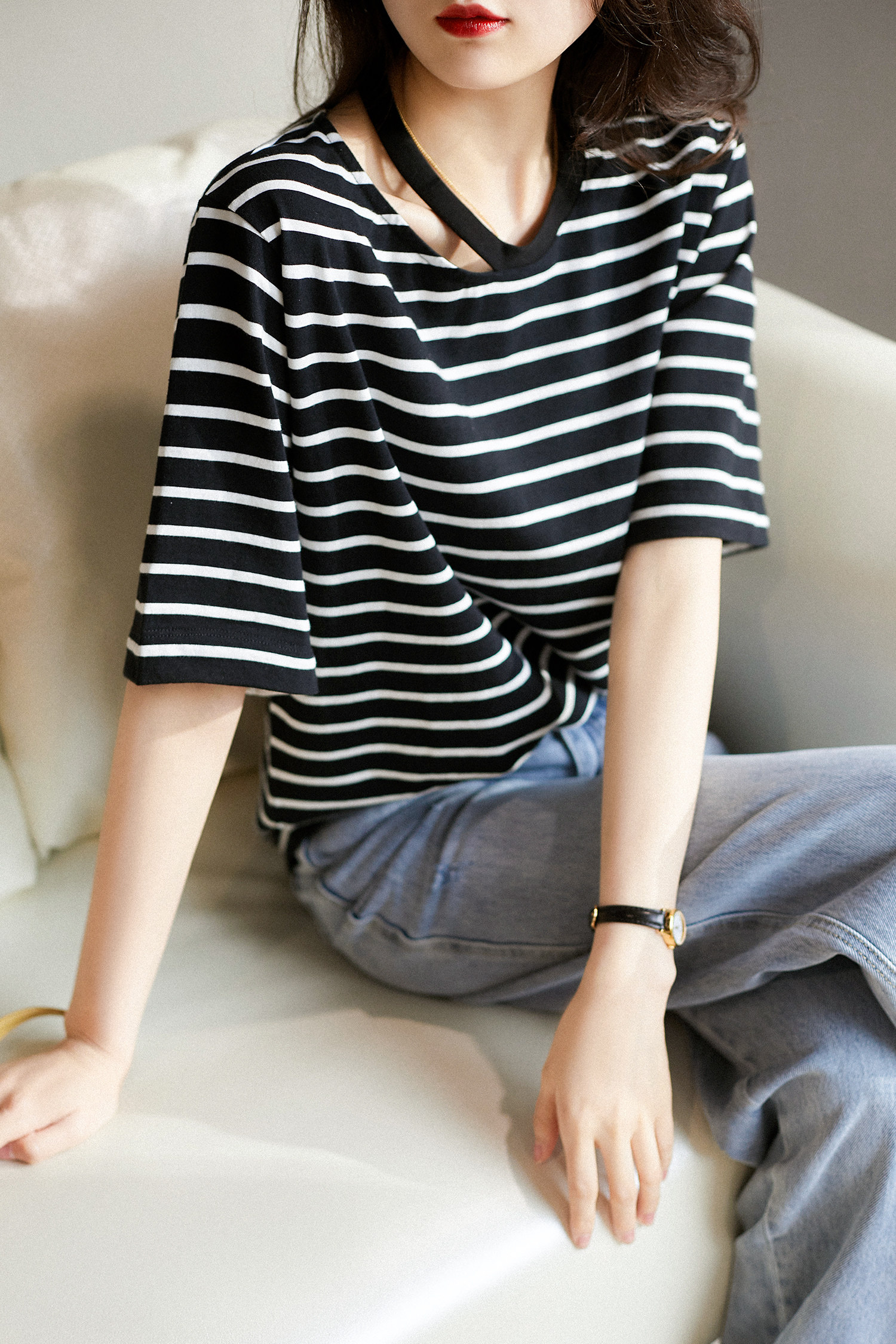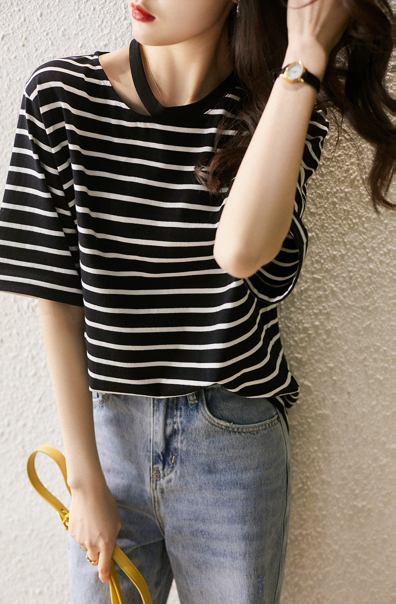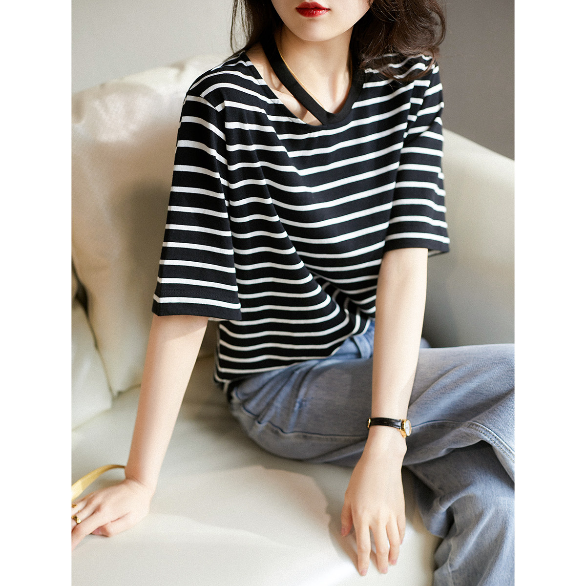 & [TX392174MG] Современный тонкий!Творческая вырез в полойной режущей конструкции All -cotton t -For