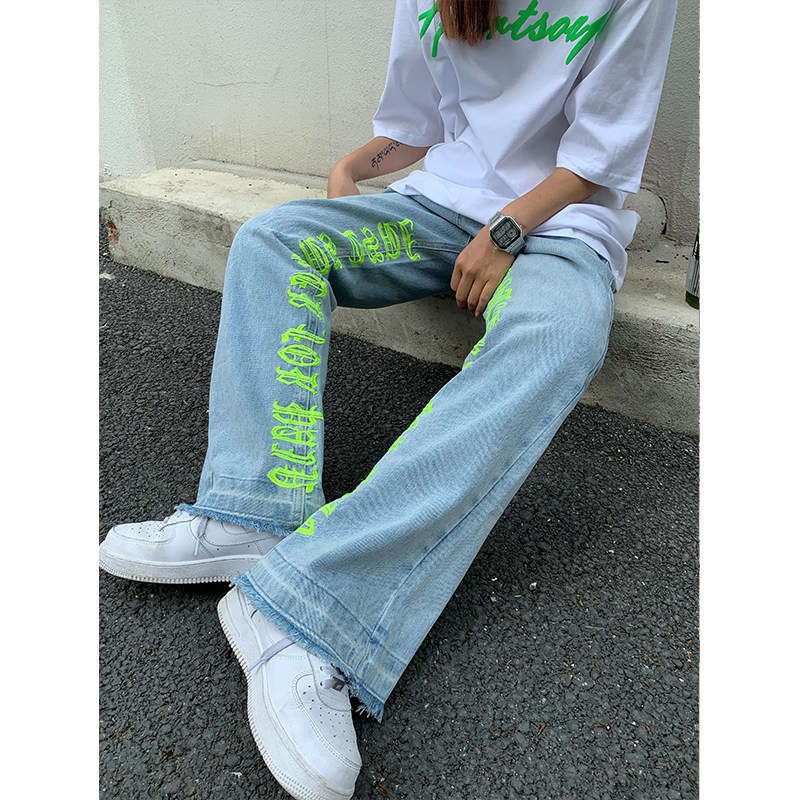 Мегафон с буквами, джинсы подходит для мужчин и женщин в стиле хип-хоп, штаны, с вышивкой, высокая талия, свободный крой