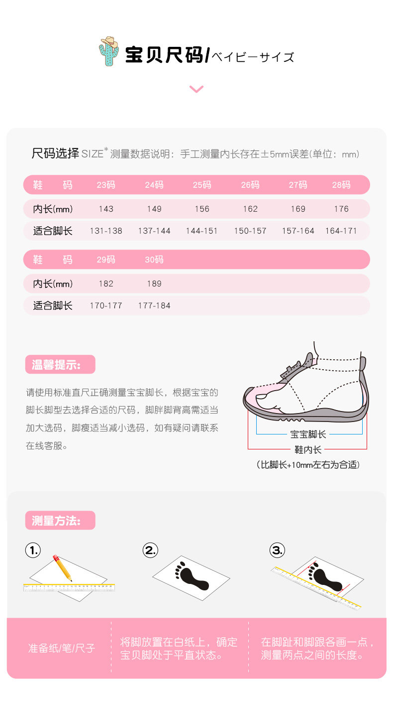 | Размер обуви: | Размер 23/внутренняя длина 14,3 см., Размер 24/внутренняя длина 14,9 см., 25 ярдов/внутри 15,6 см, 26 ярдов/внутри 16,2 см, 27 ярдов/внутренняя длина 16,9 см., 28 ярдов/внутри 17,6 см, 29 ярдов/внутри 18,2 см, 30 ярдов/внутри 18,9 см. |