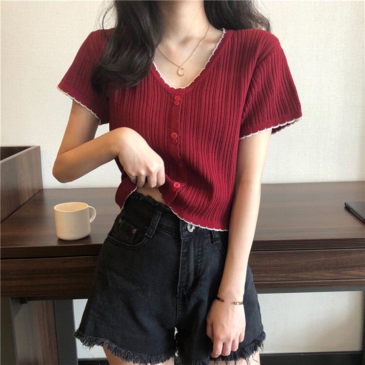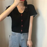 Трикотажная милая короткая футболка, большой размер, короткий рукав, V-образный вырез