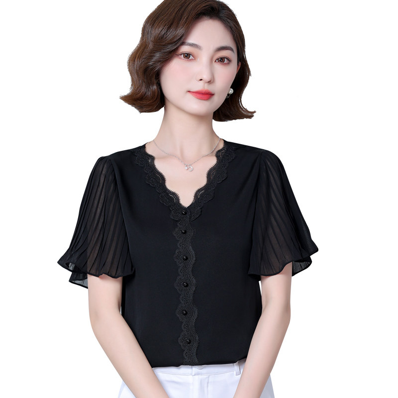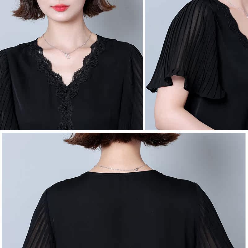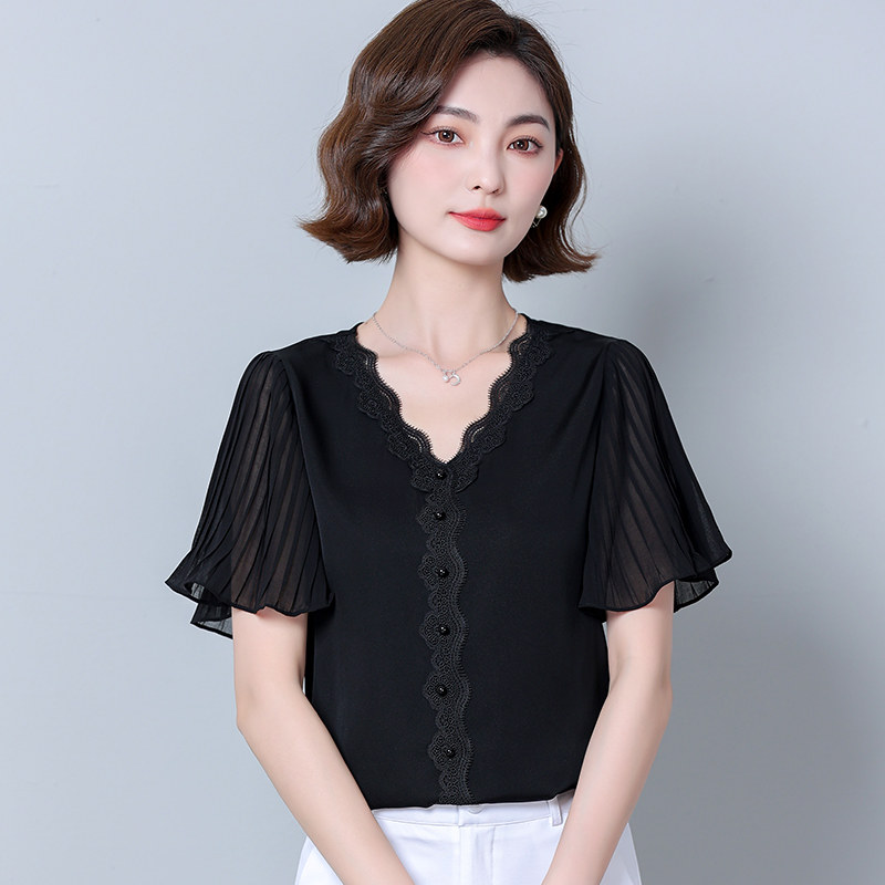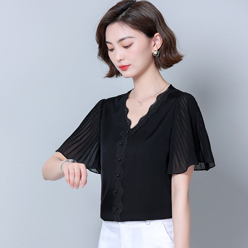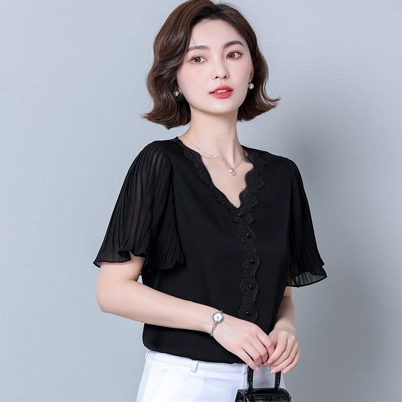 Шифоновая летняя кружевная шелковая черная рубашка, свободный крой, V-образный вырез, коллекция 2023