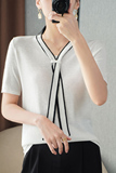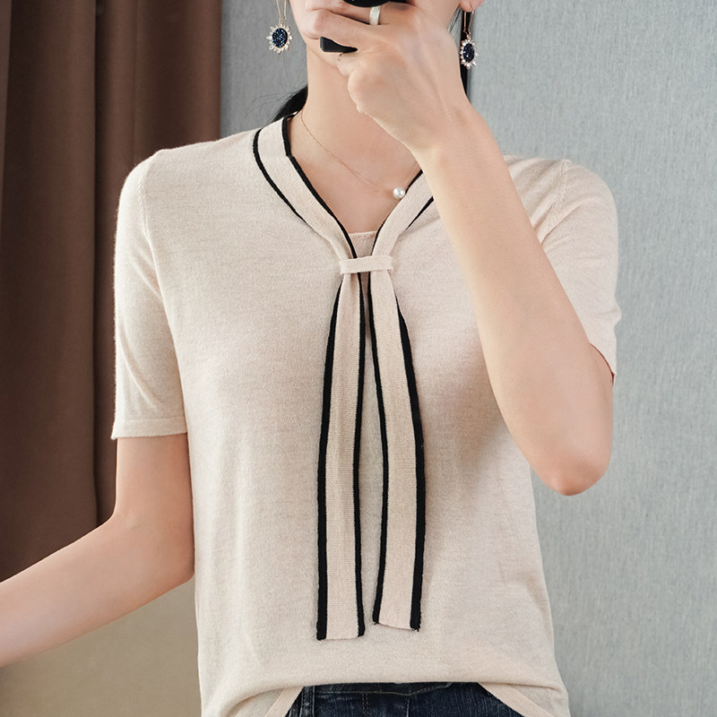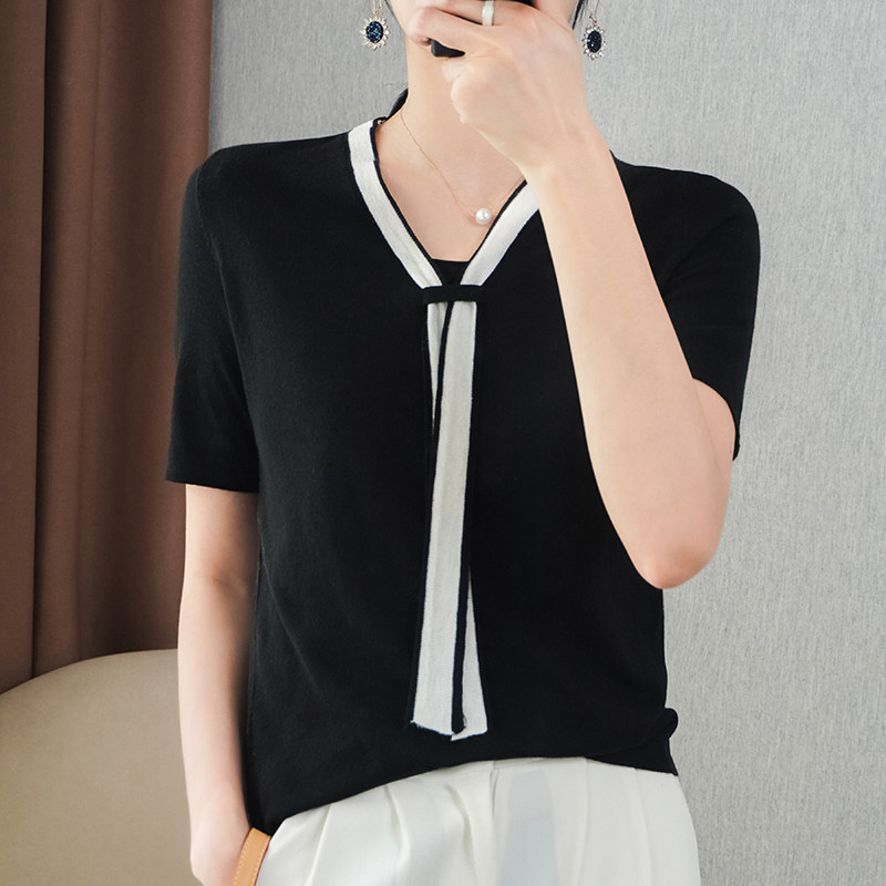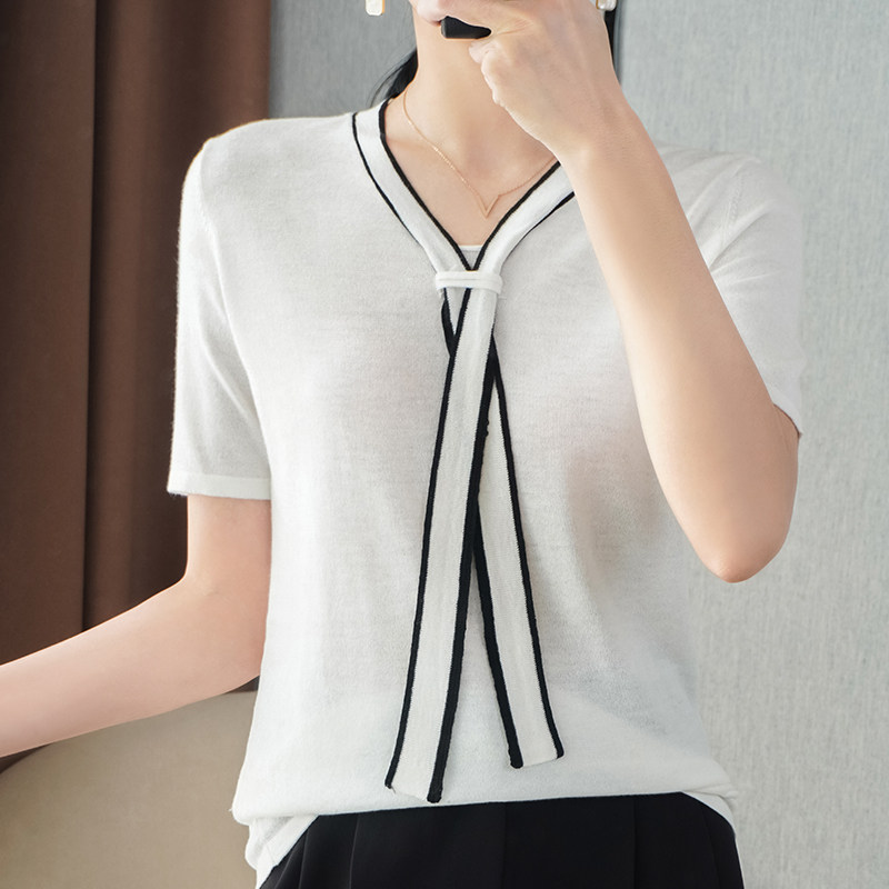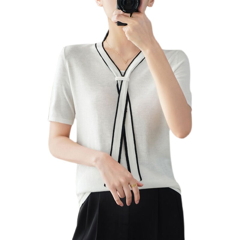 Летняя трикотажная футболка с коротким рукавом, шарф, V-образный вырез, в западном стиле, оверсайз, высокий воротник