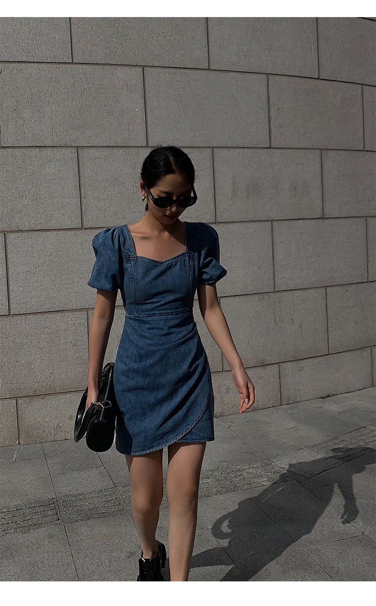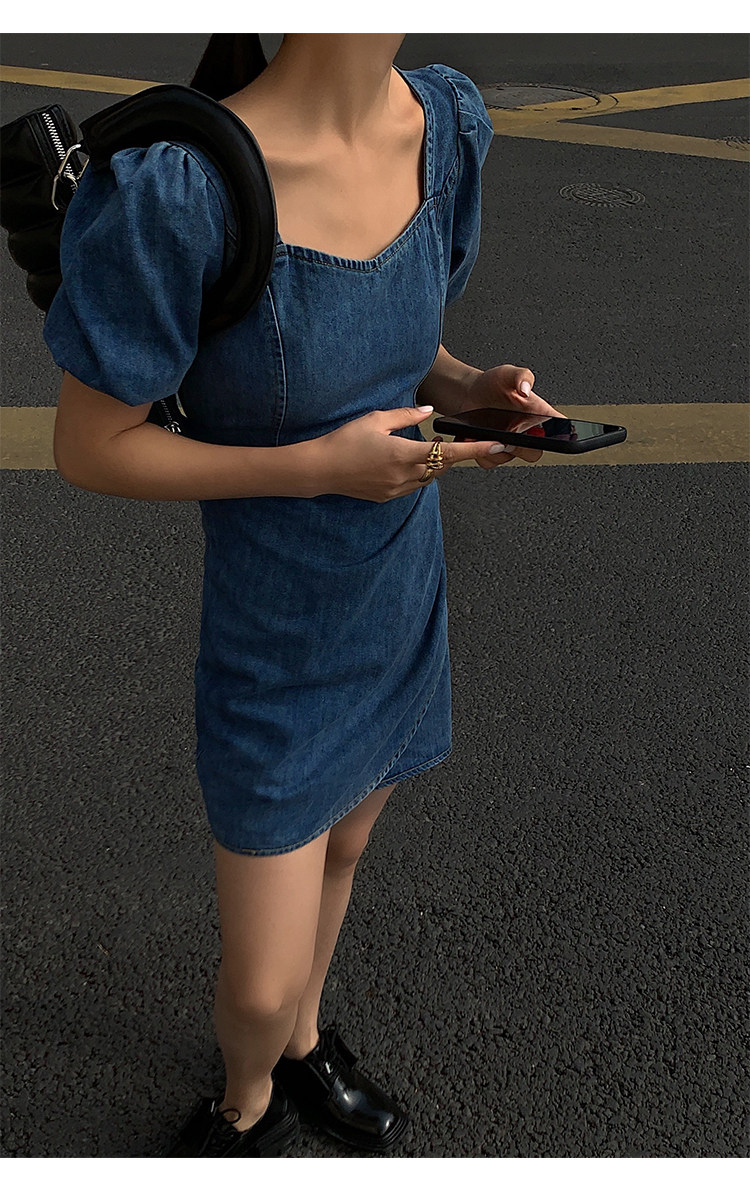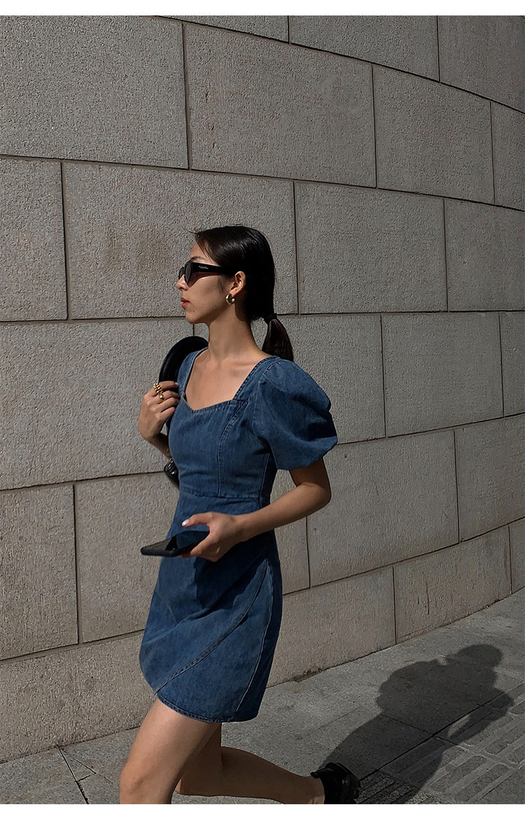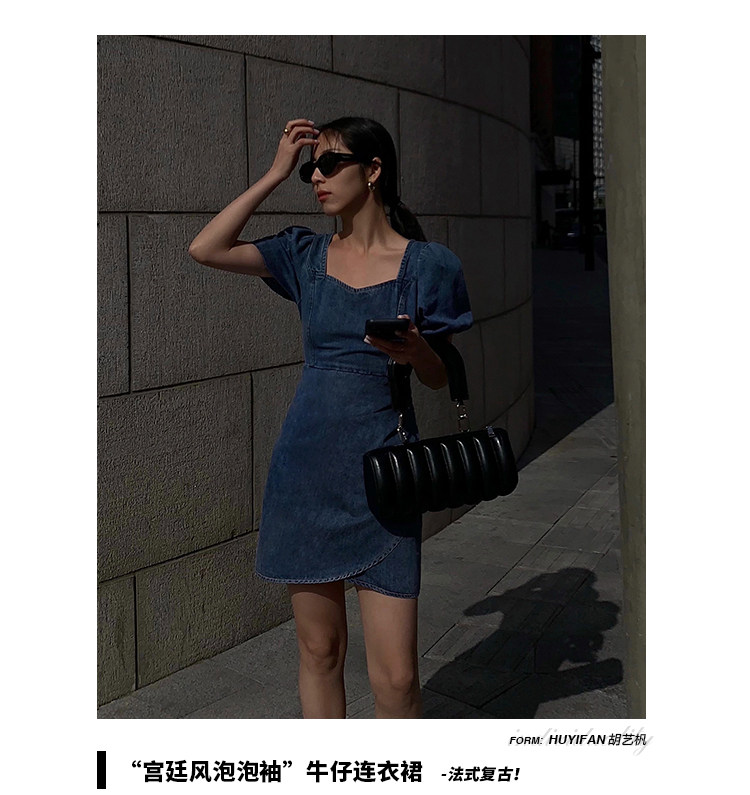 Летнее ретро джинсовое платье, приталенный корсет, мини-юбка, сезон 2021, квадратный вырез, рукава фонарики, высокая талия