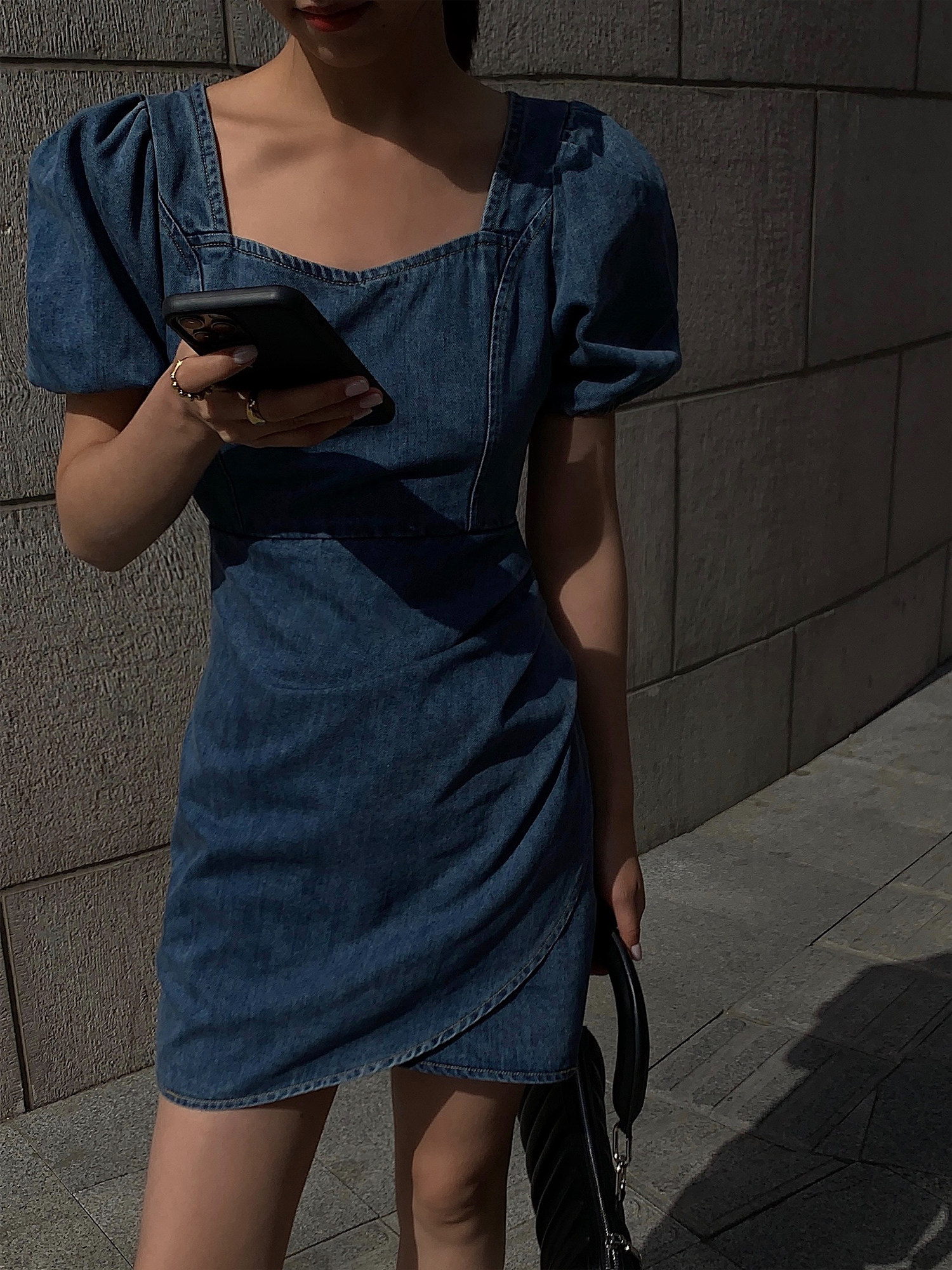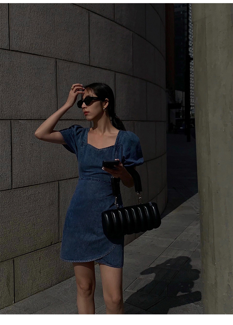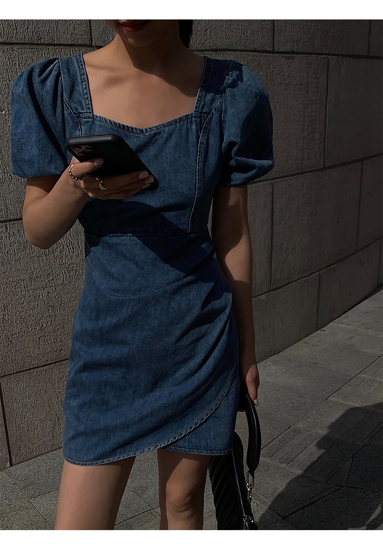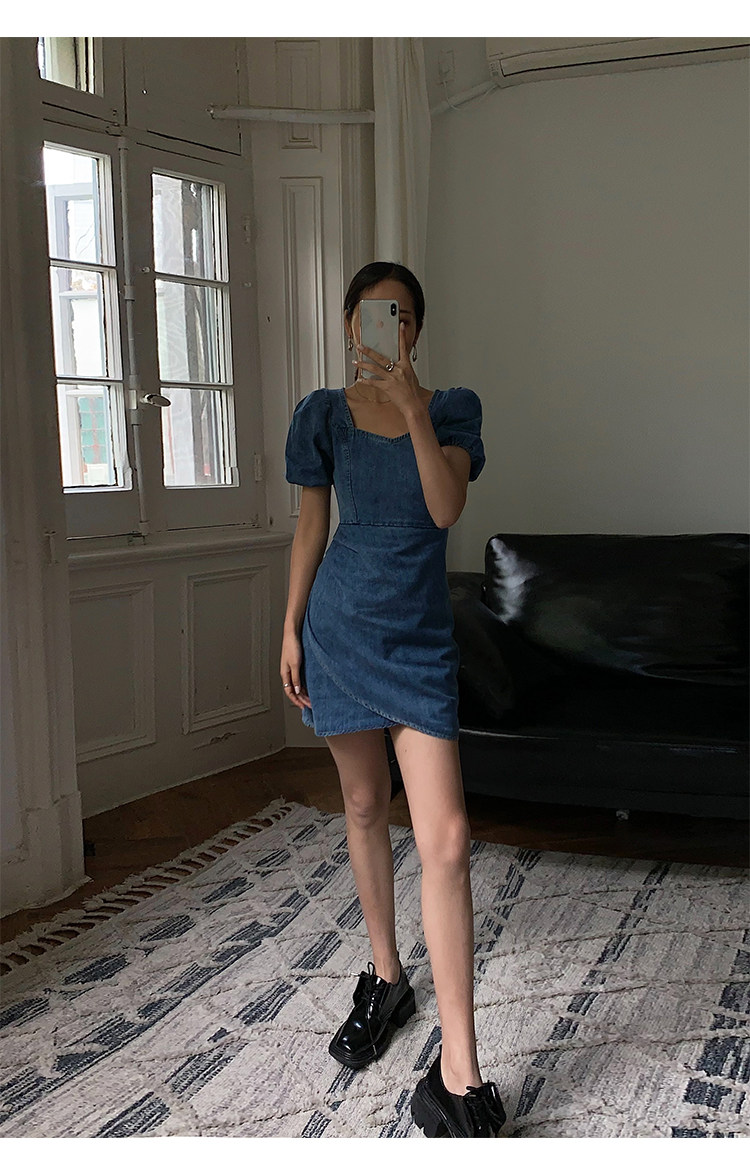 Летнее ретро джинсовое платье, приталенный корсет, мини-юбка, сезон 2021, квадратный вырез, рукава фонарики, высокая талия