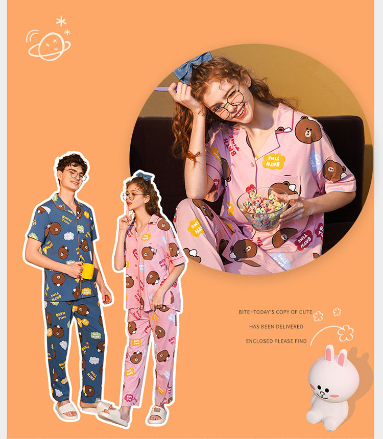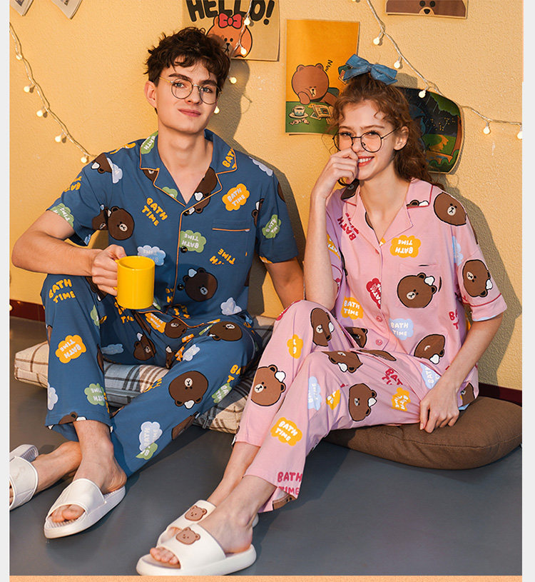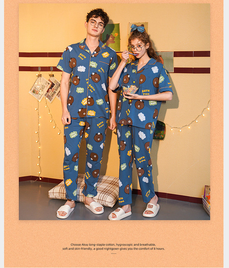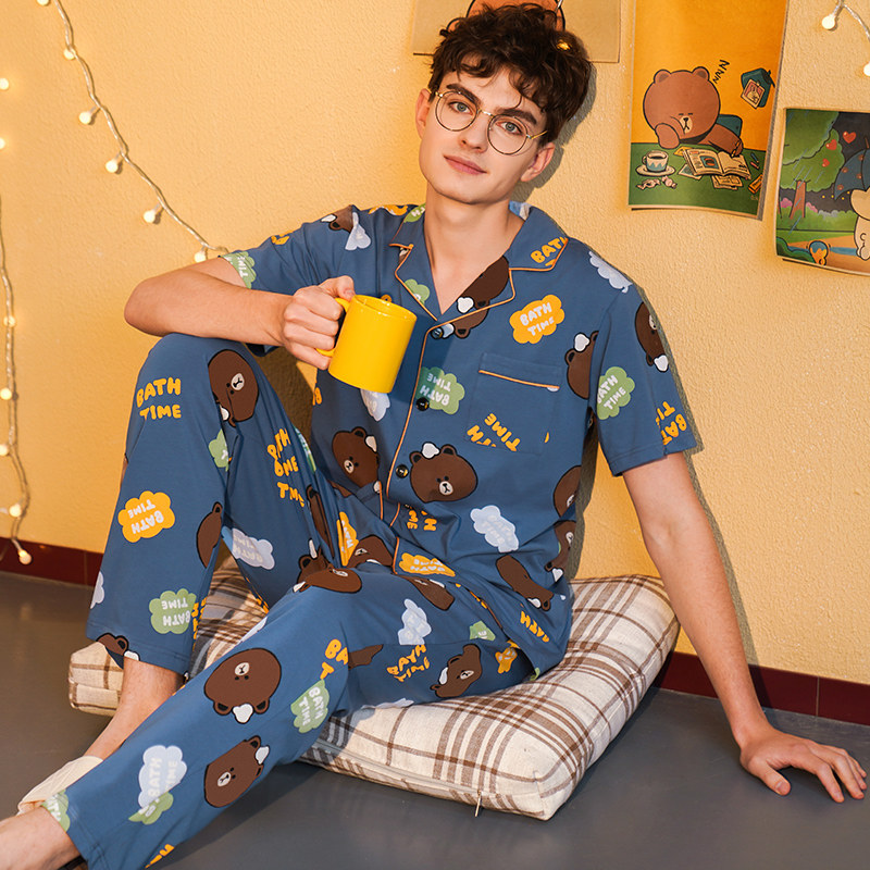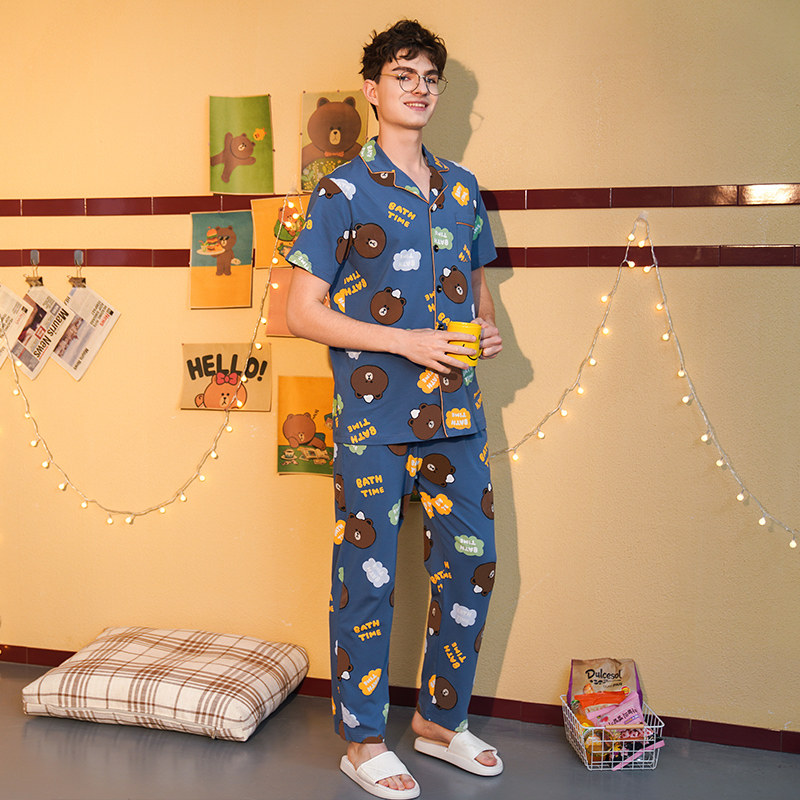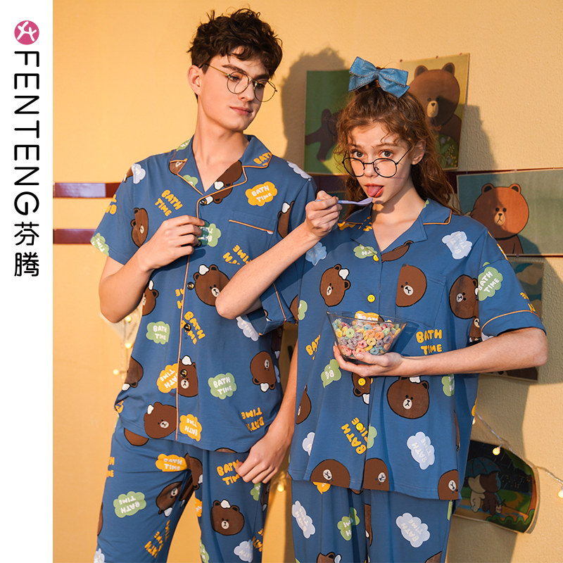 芬腾 Летняя хлопковая пижама, тонкие мультяшные штаны, мужской комплект, для влюбленных, короткий рукав