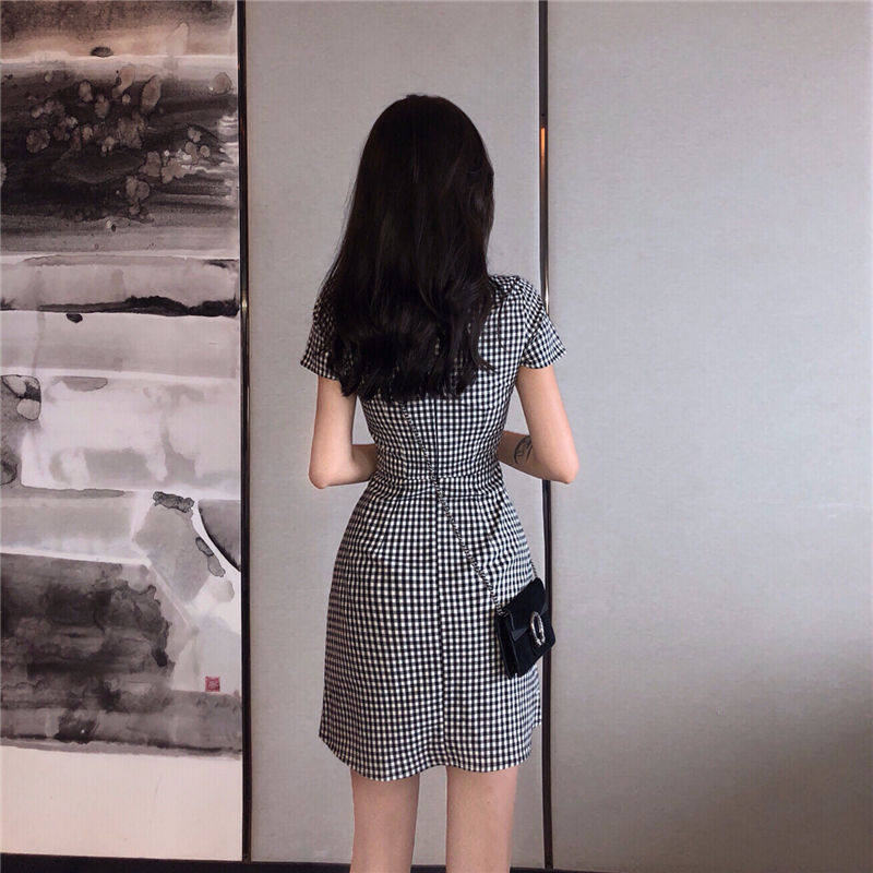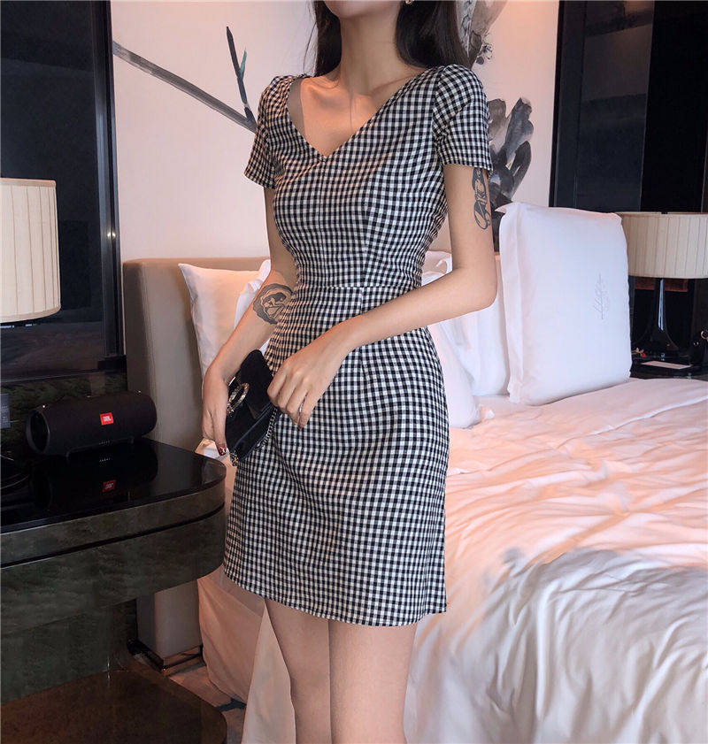 Приталенный корсет, летнее платье, ретро короткая юбка, V-образный вырез, А-силуэт, городской стиль, яркий броский стиль, короткий рукав