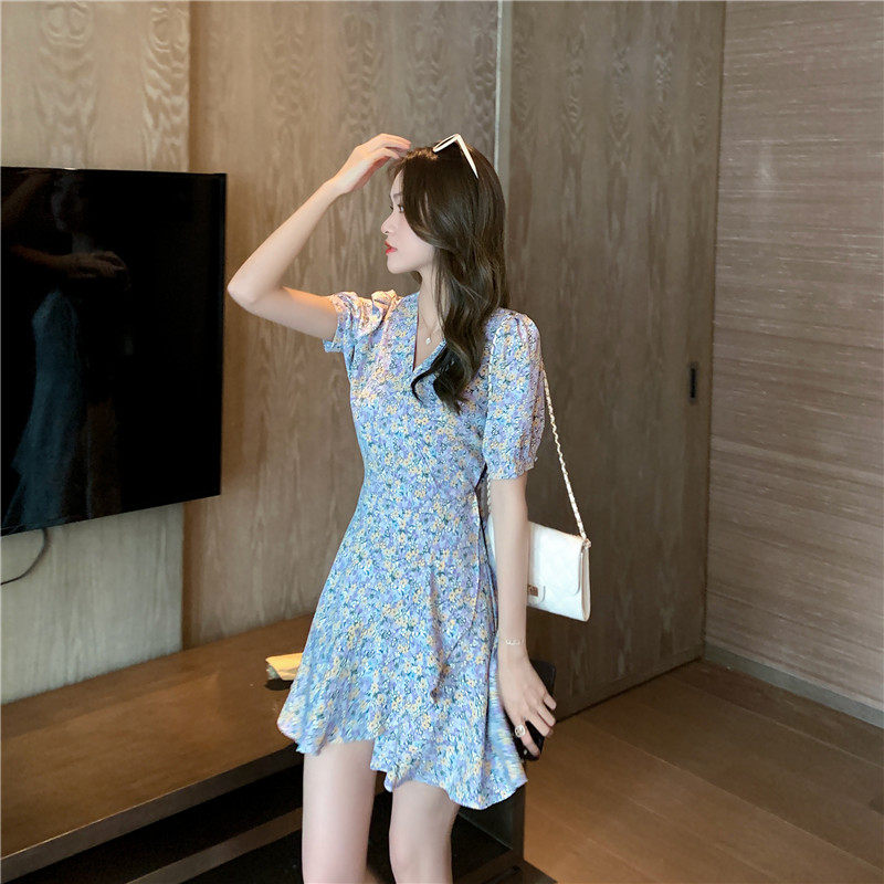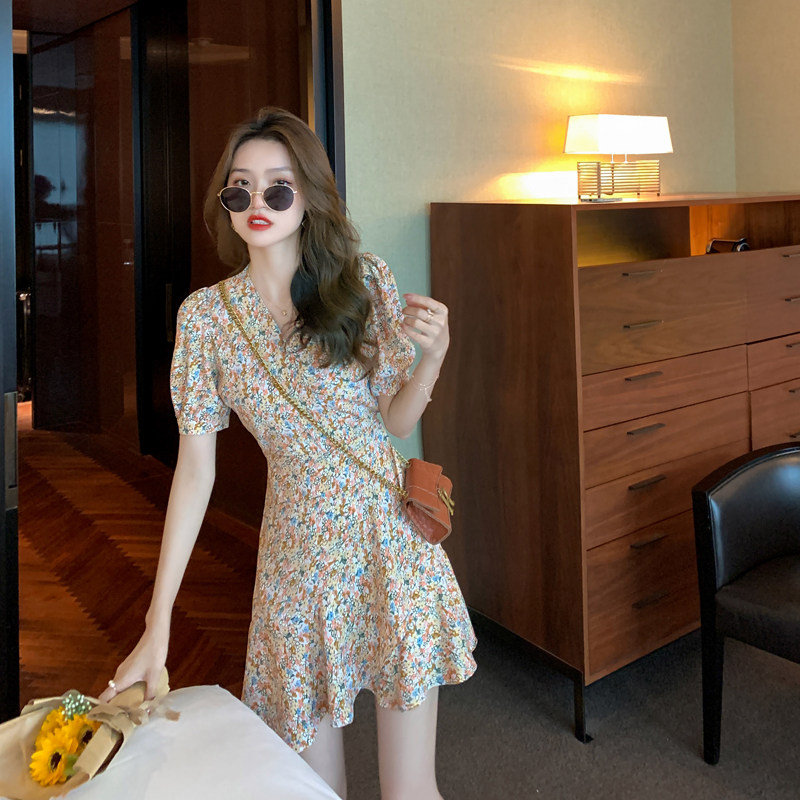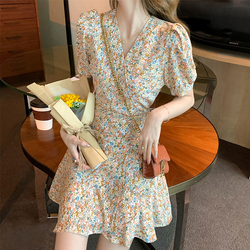 Ретро летнее приталенное дизайнерское платье, французский стиль, в цветочек, яркий броский стиль, тренд сезона, подходит для подростков
