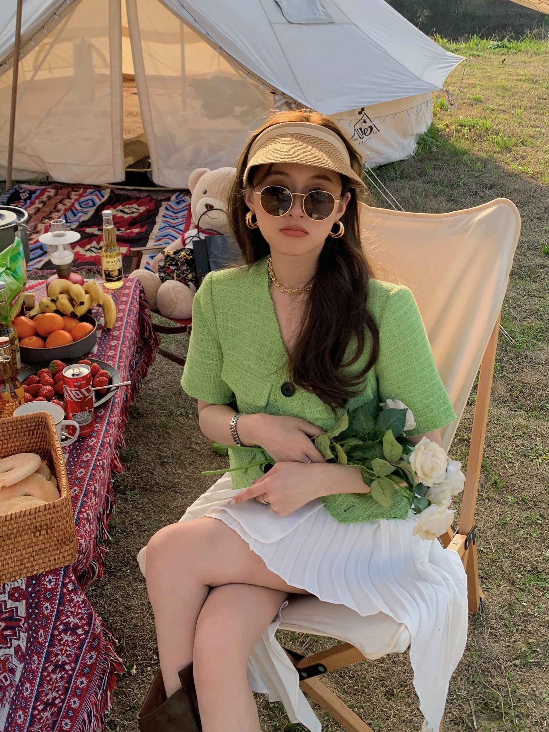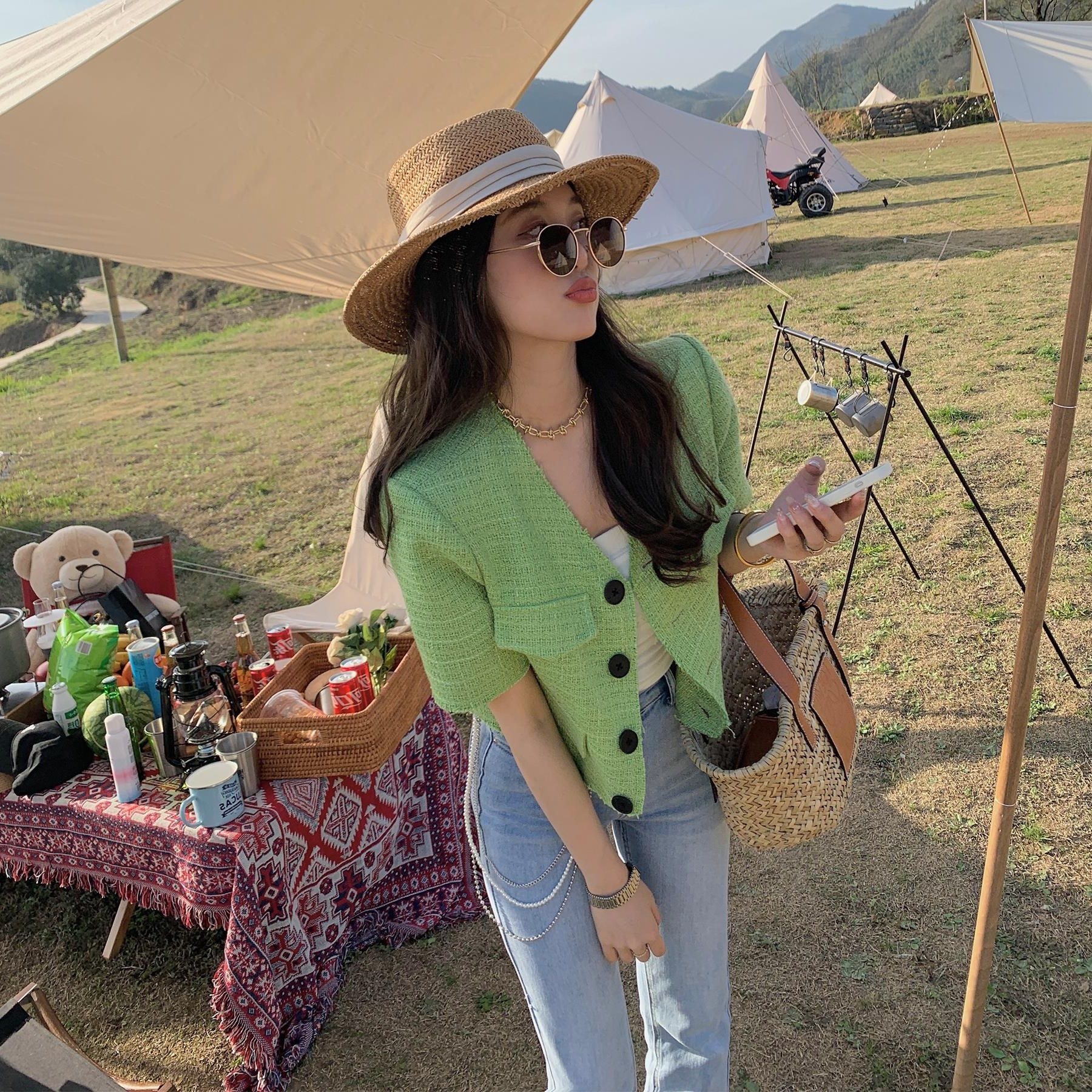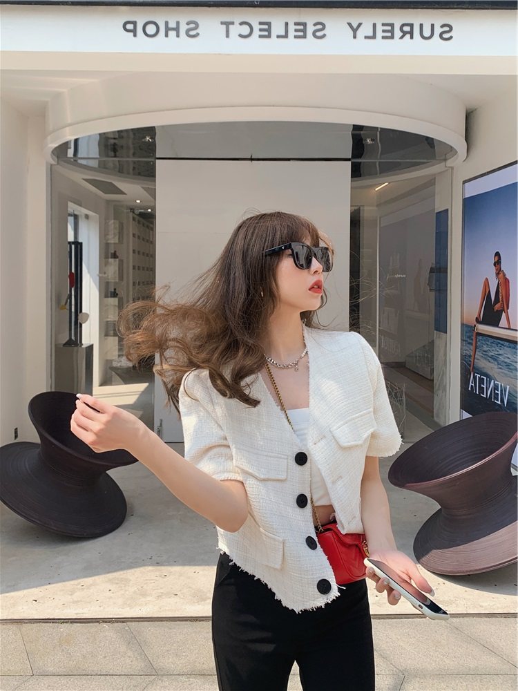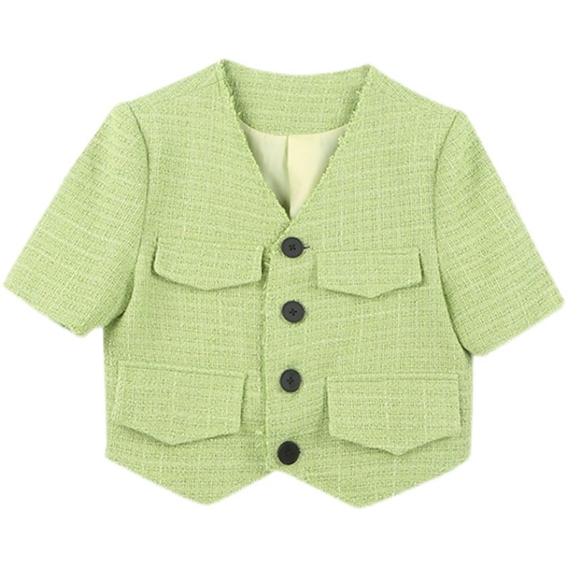 Короткая плетеная летняя куртка, тонкий зеленый пиджак классического кроя, в стиле Шанель, короткий рукав