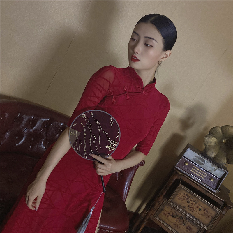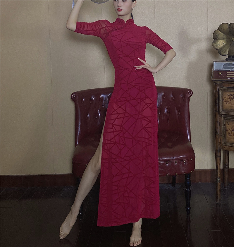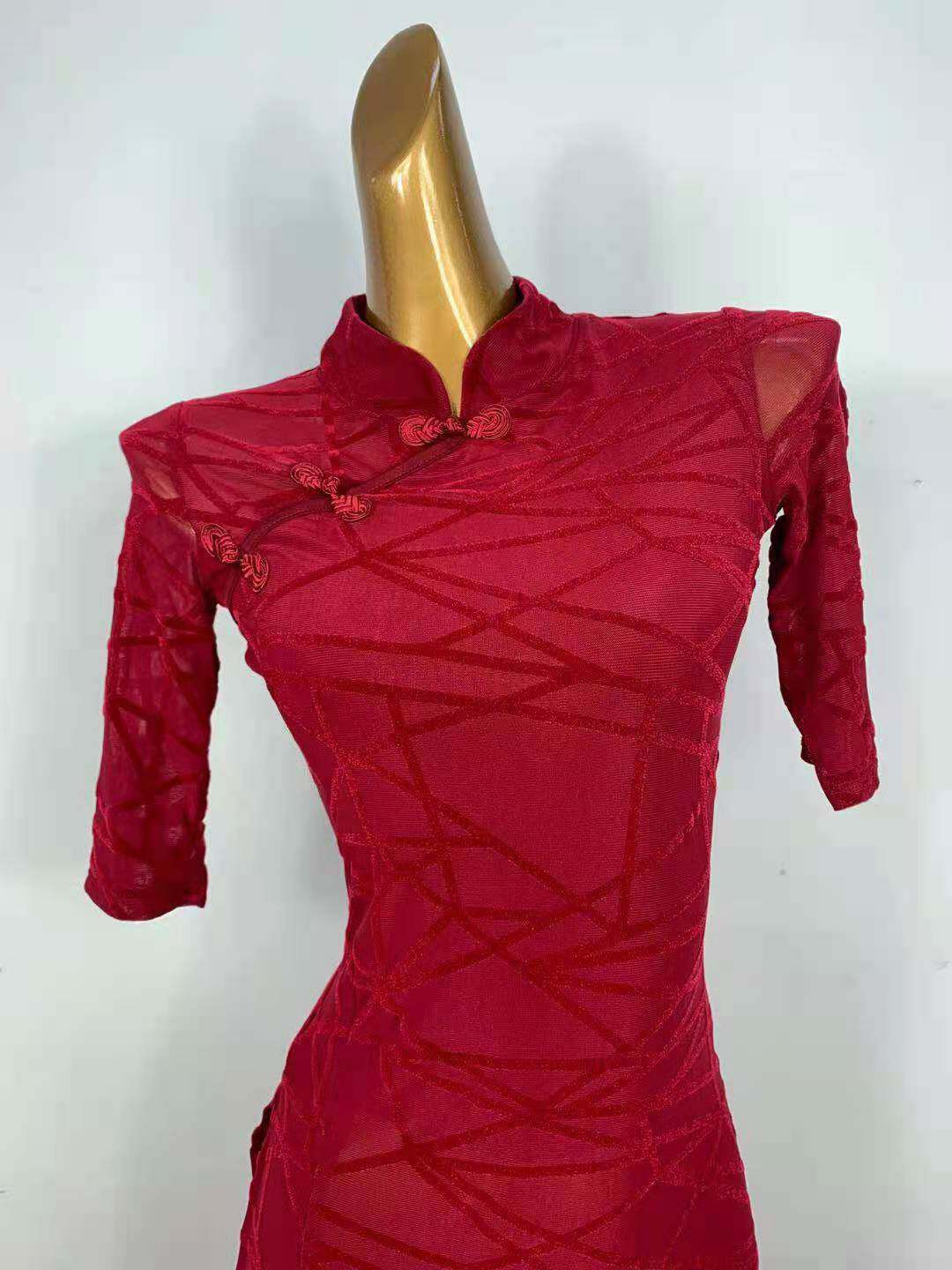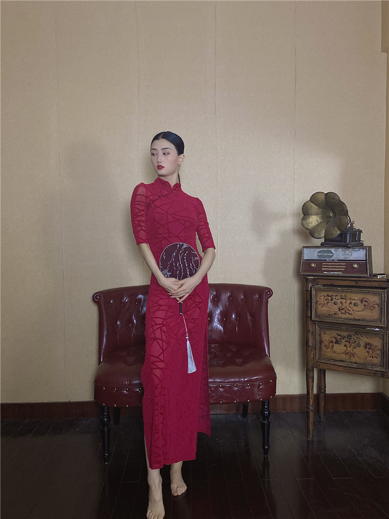 - Однотонный чонсам бордового цвета [без флокирования]