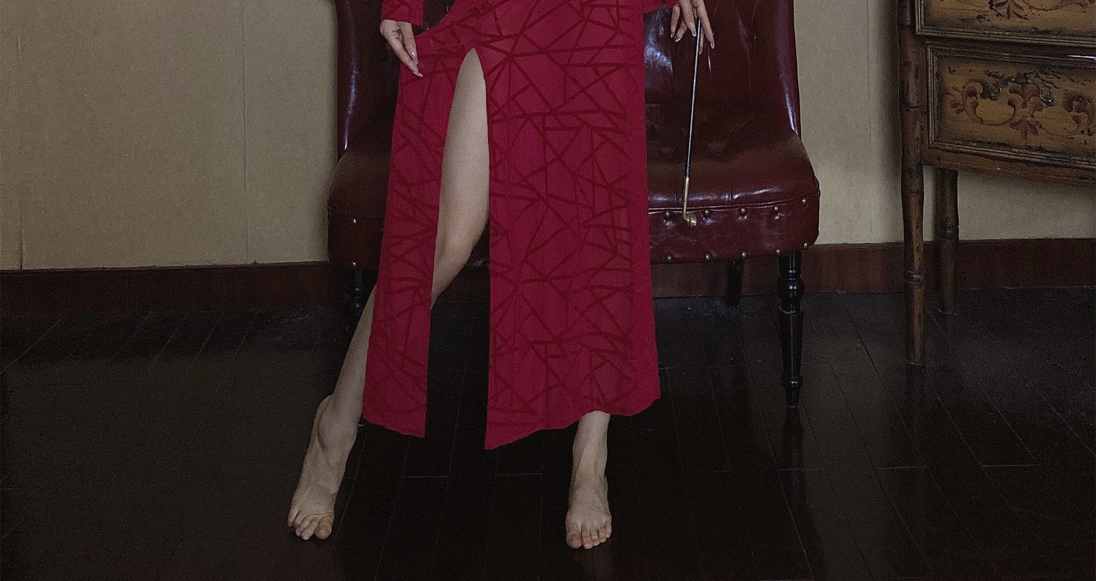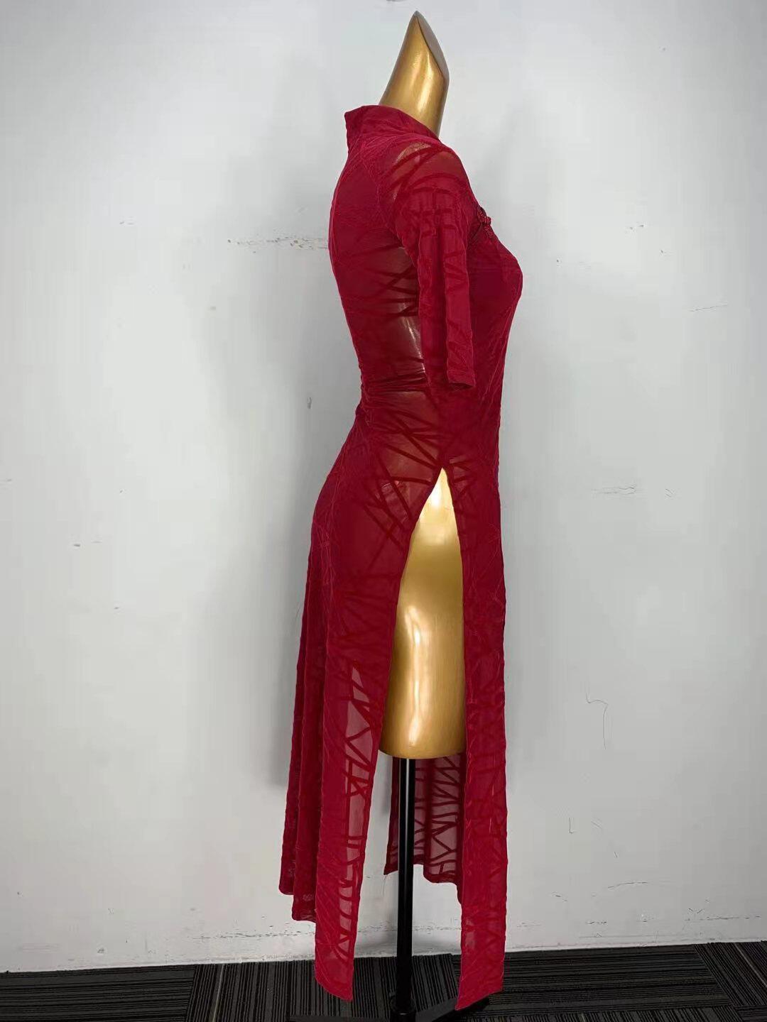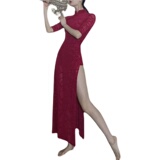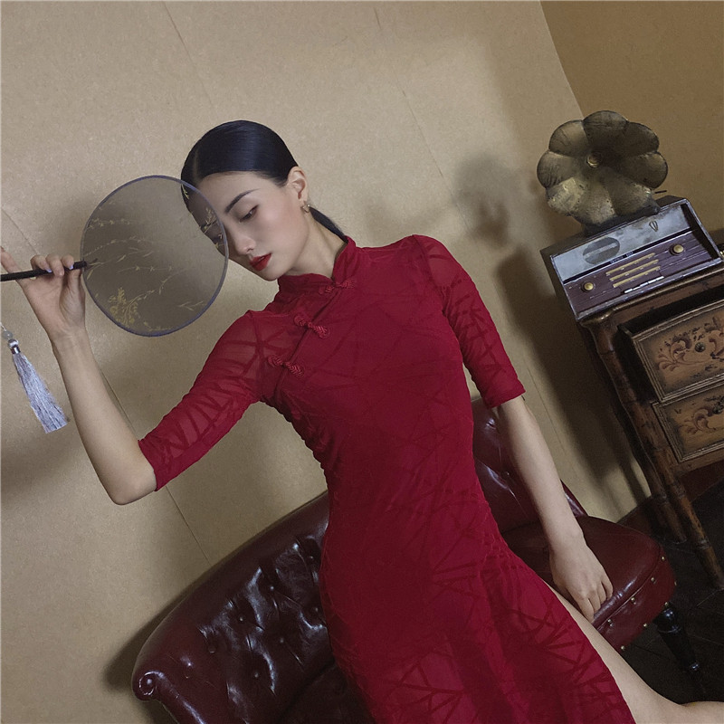 - Однотонный чонсам бордового цвета [без флокирования]