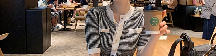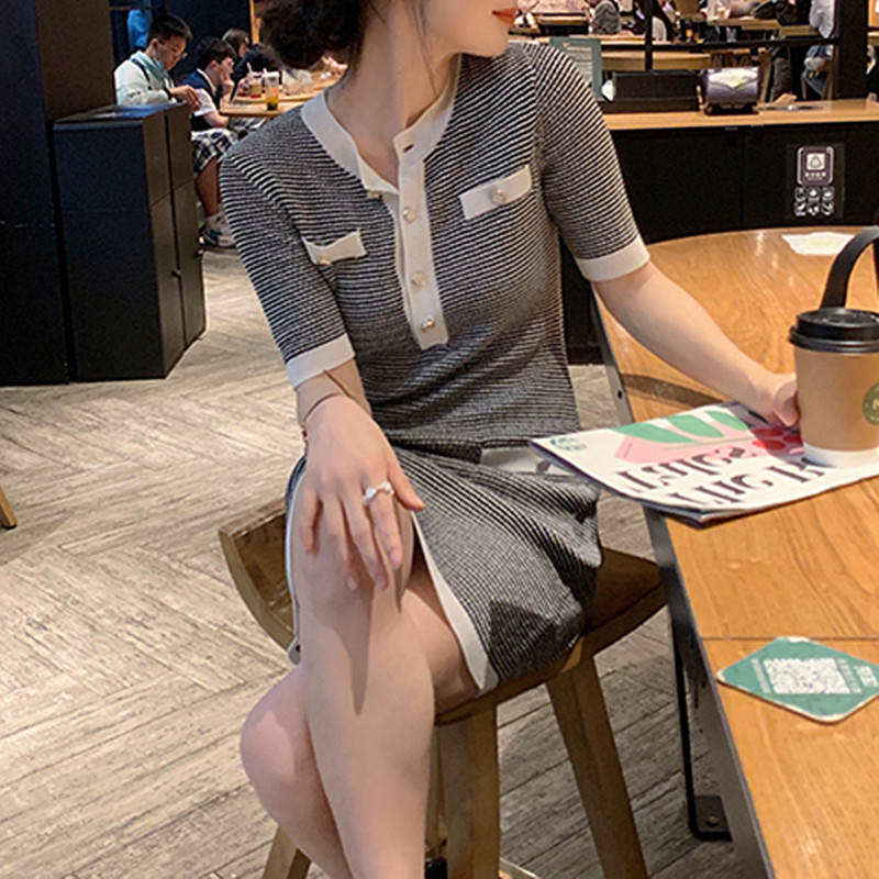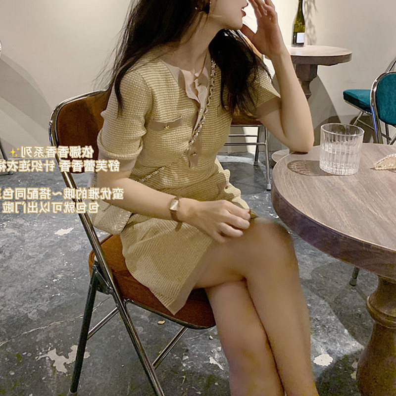 Трикотажное трикотажное платье, юбка с круглым воротником, в стиле Шанель, короткий рукав, с рукавом, яркий броский стиль