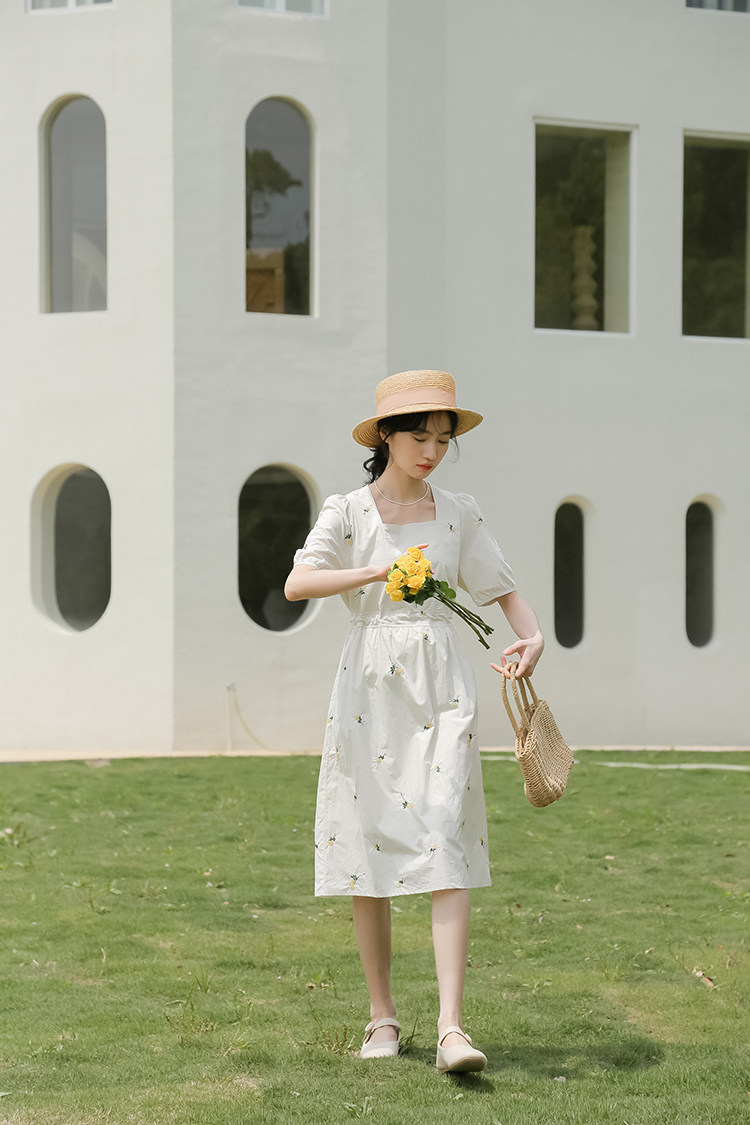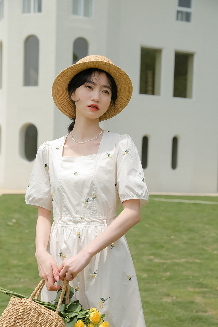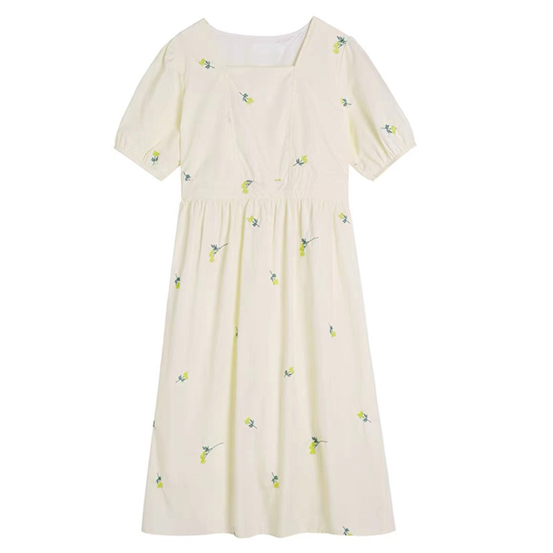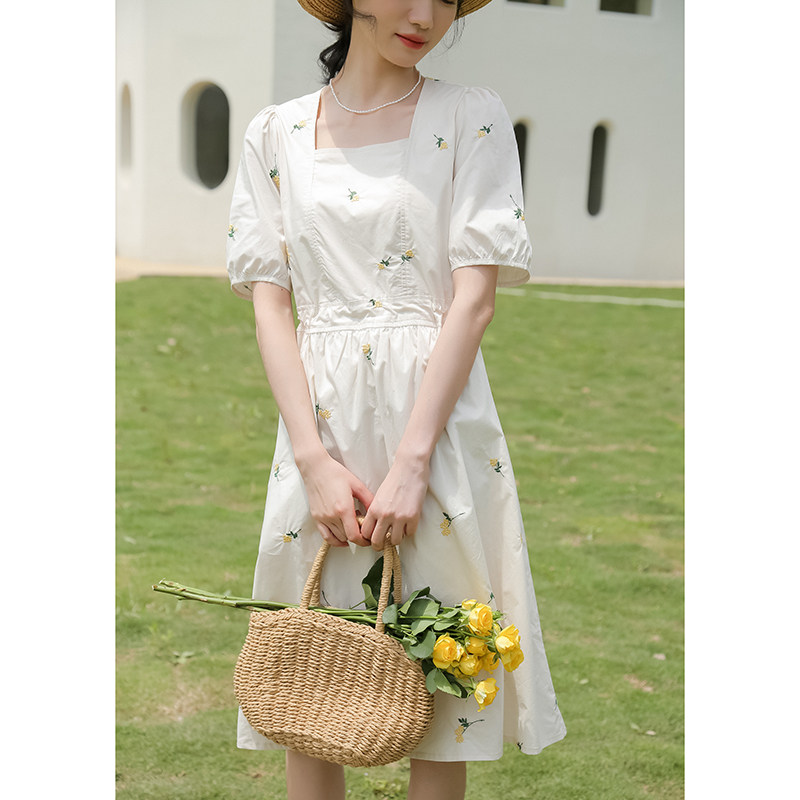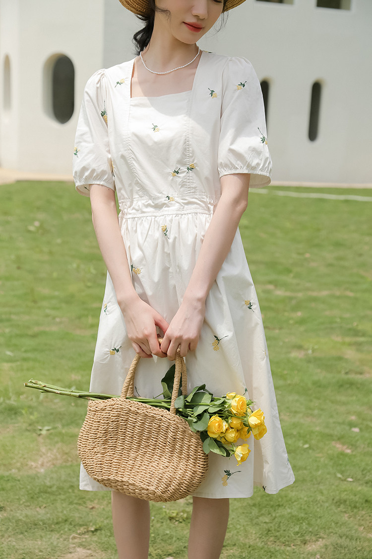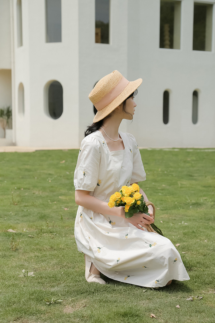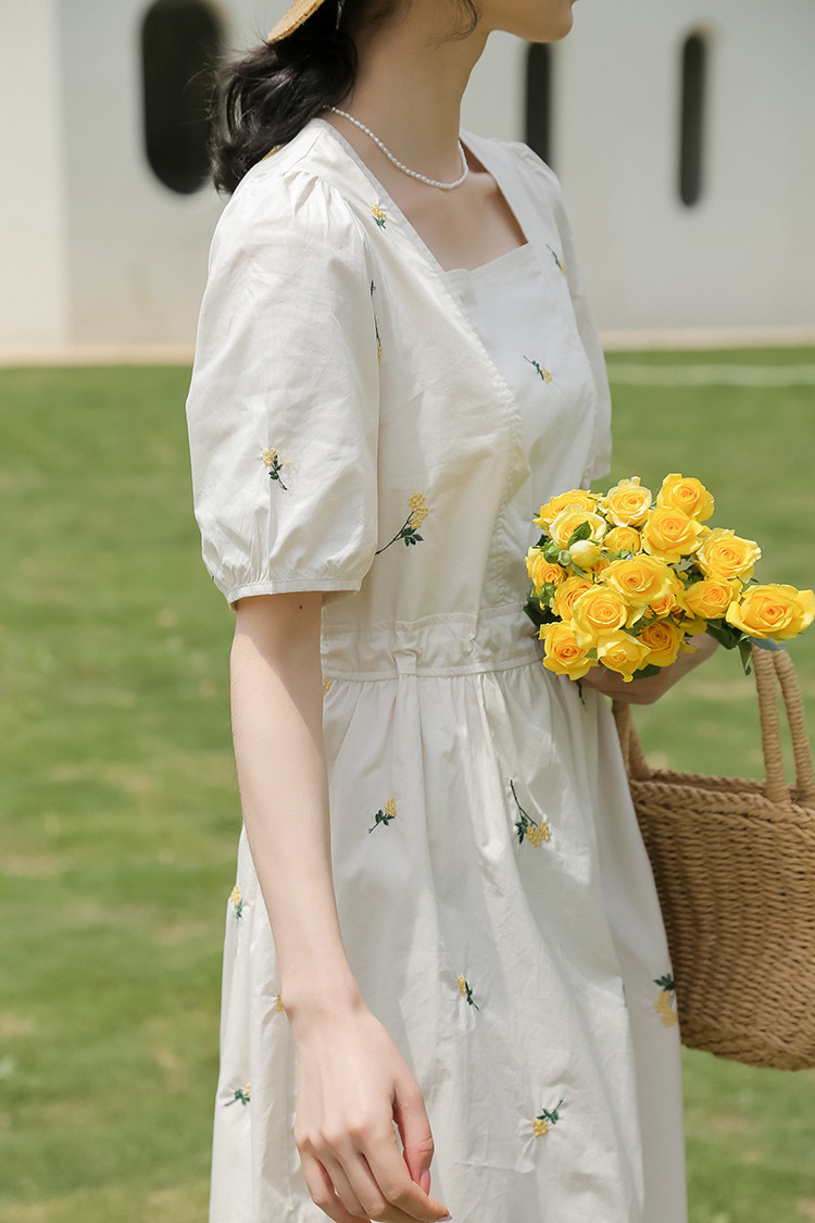 Платье в форме цветка, длинная юбка, эластичная талия, с вышивкой, квадратный вырез, средней длины, французский стиль, в цветочек