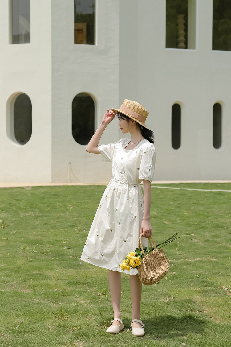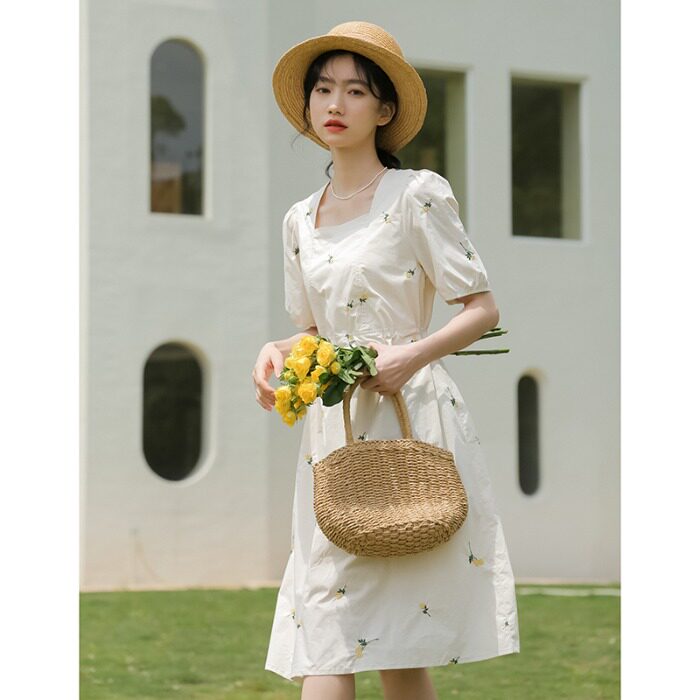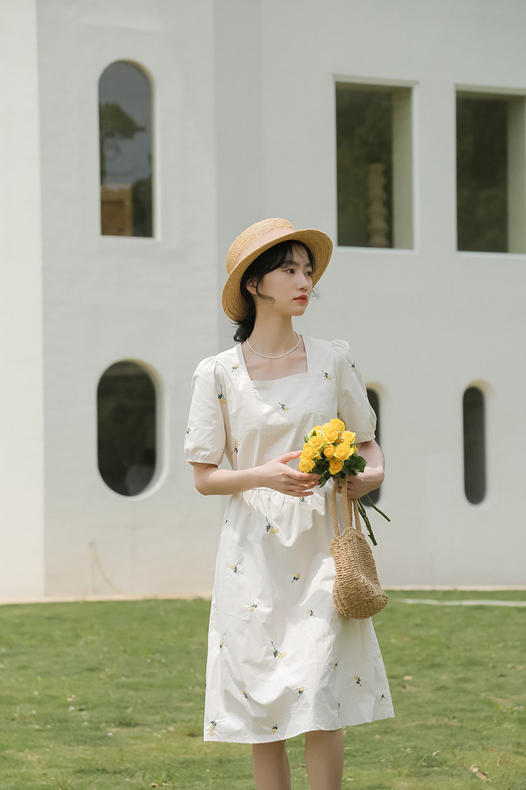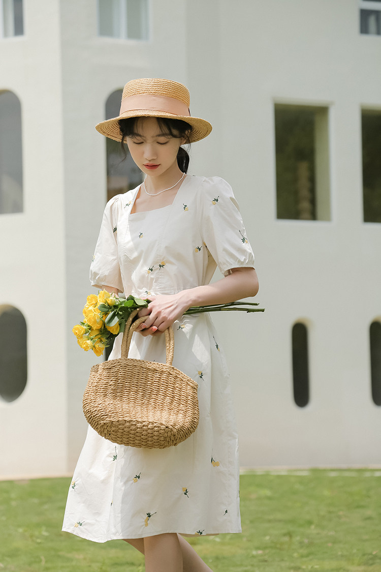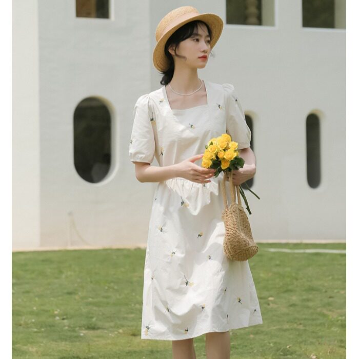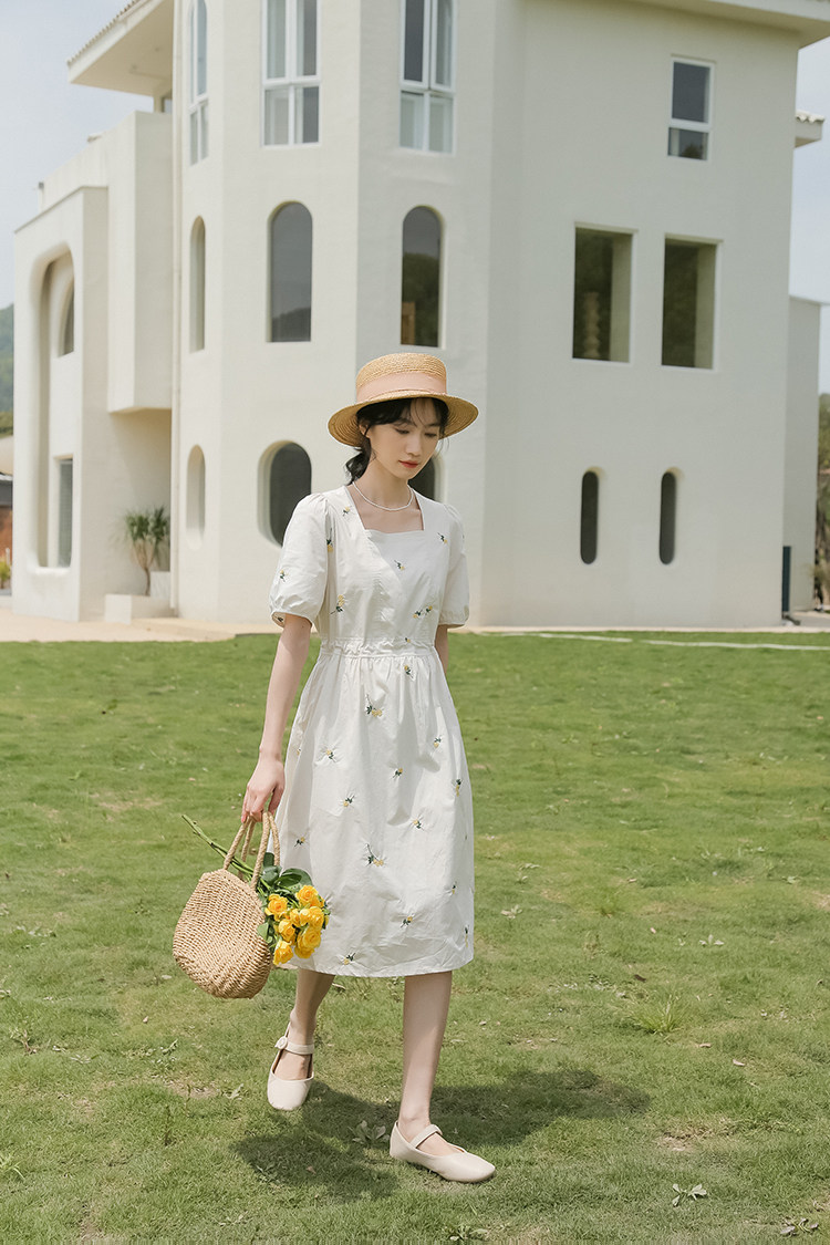 Платье в форме цветка, длинная юбка, эластичная талия, с вышивкой, квадратный вырез, средней длины, французский стиль, в цветочек