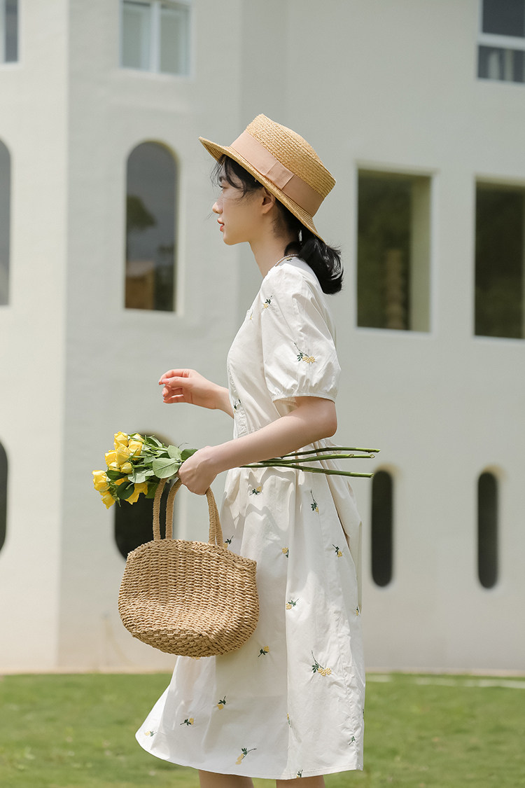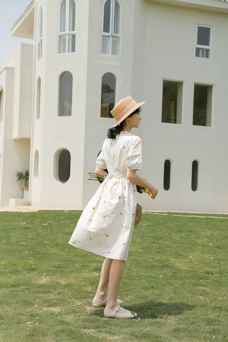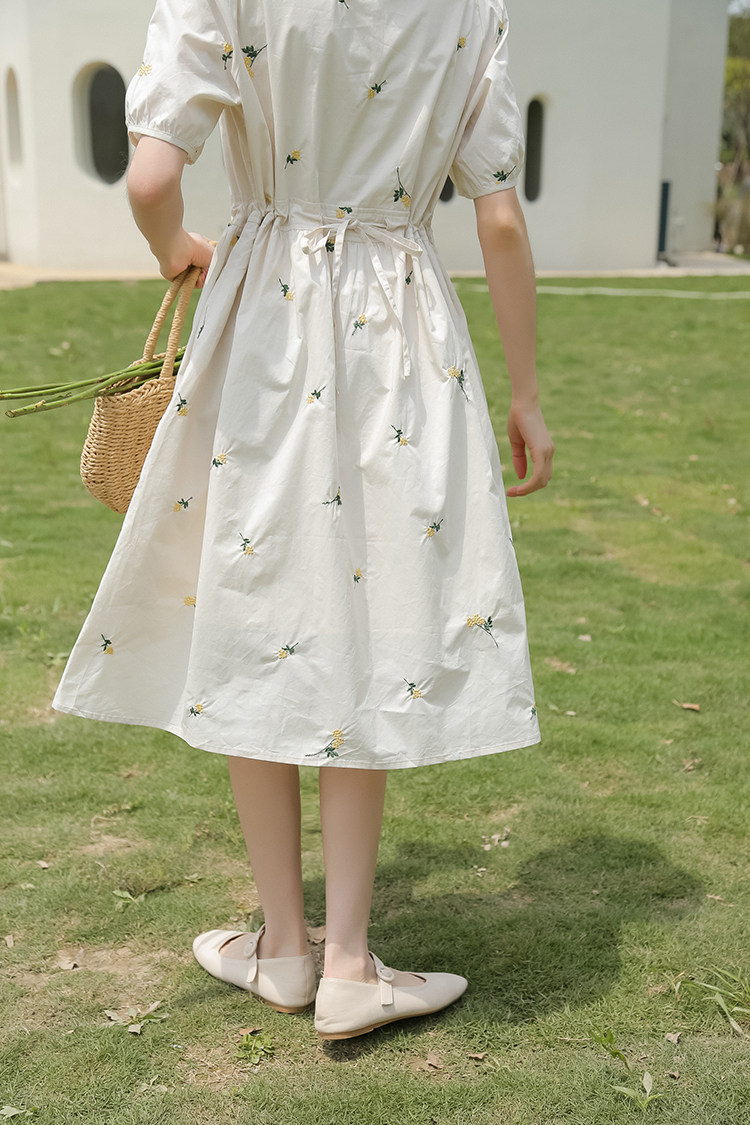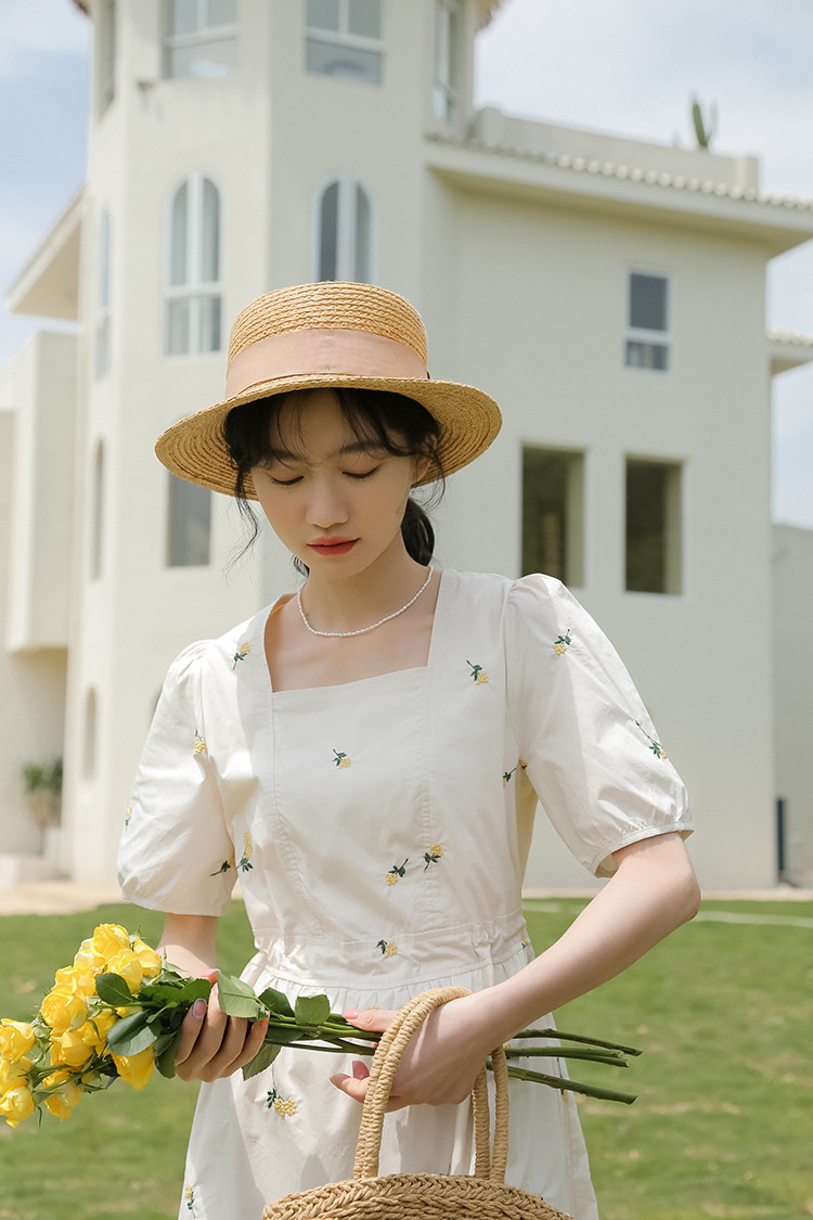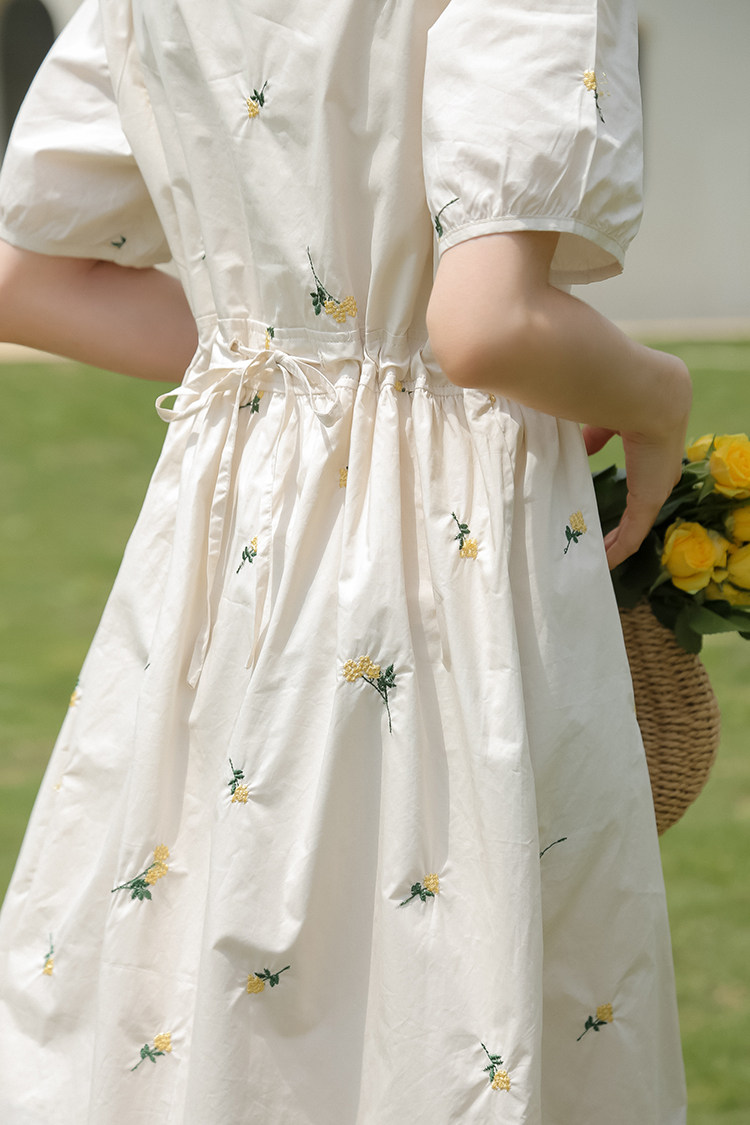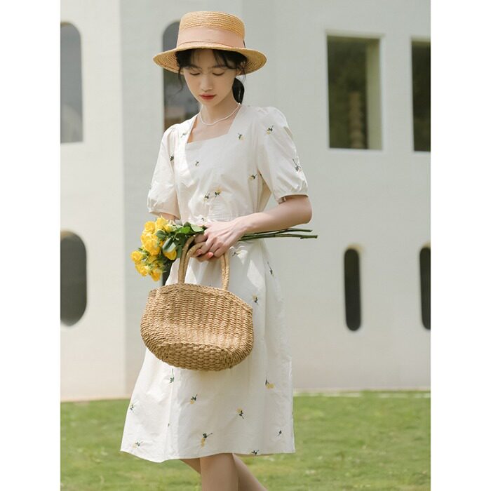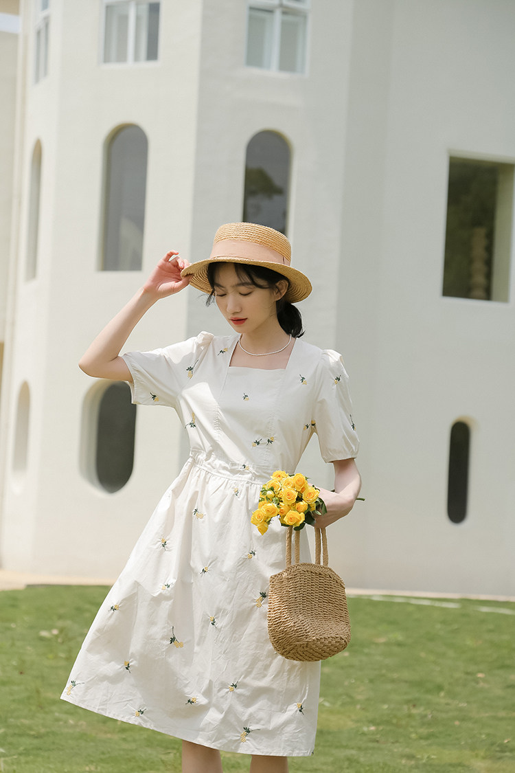 Платье в форме цветка, длинная юбка, эластичная талия, с вышивкой, квадратный вырез, средней длины, французский стиль, в цветочек