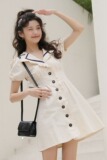 Платье, абрикосовая мини-юбка, коллекция 2021, V-образный вырез, рукава фонарики, А-силуэт