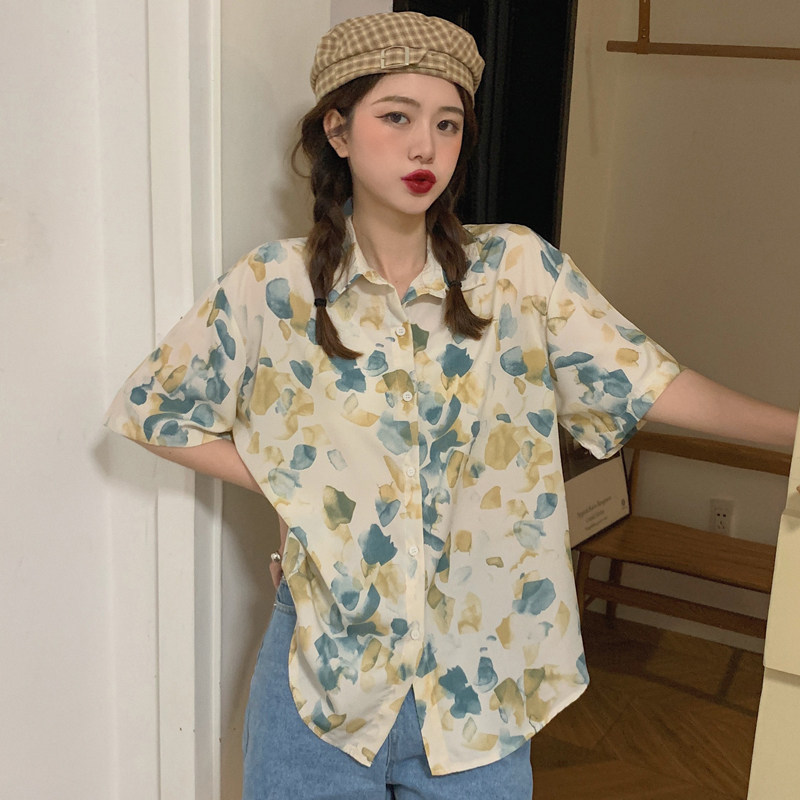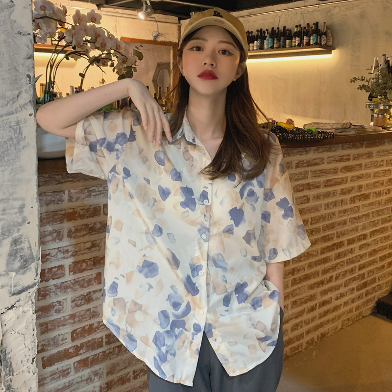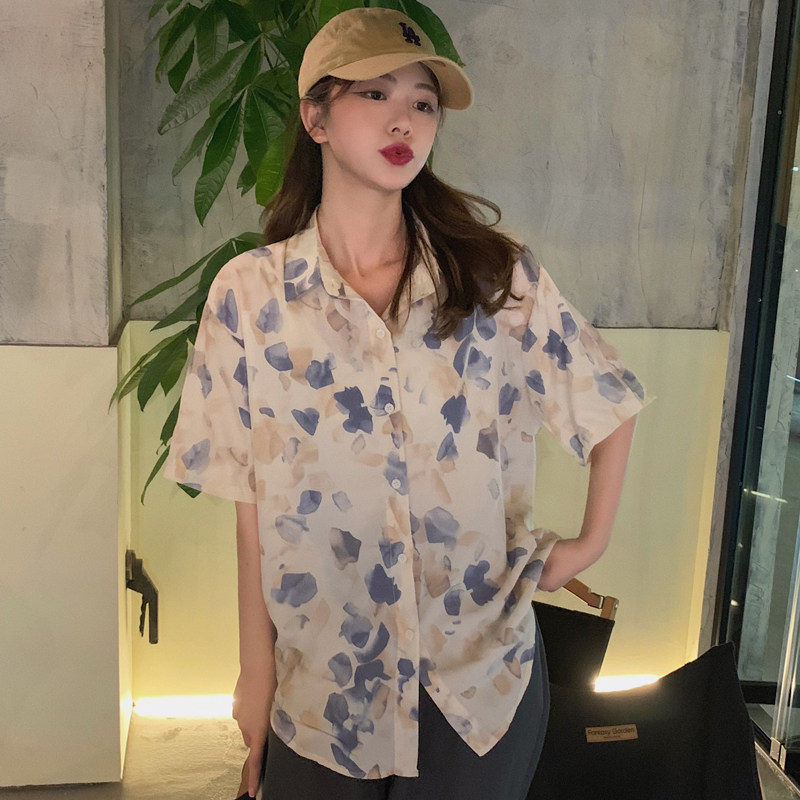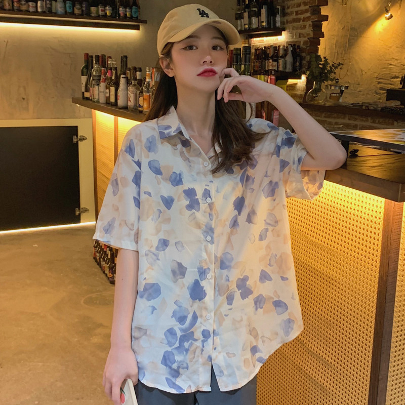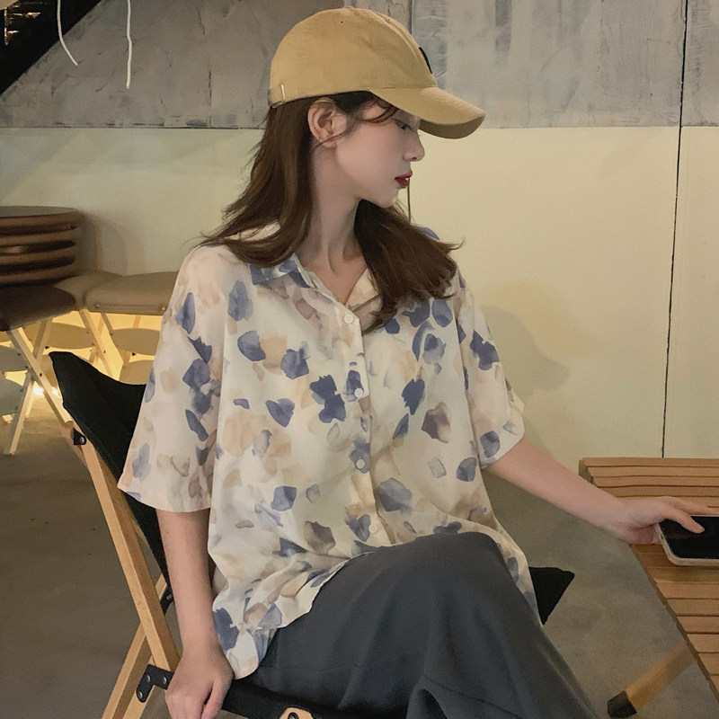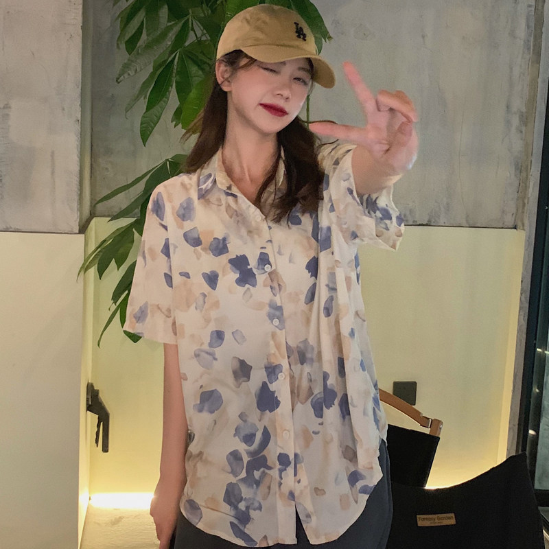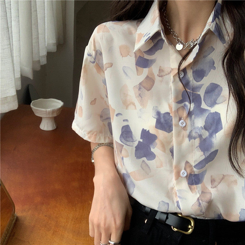 Тонкая ретро дизайнерская рубашка, оверсайз, в корейском стиле, цветочный принт, короткий рукав, защита от солнца, французский стиль, тренд сезона