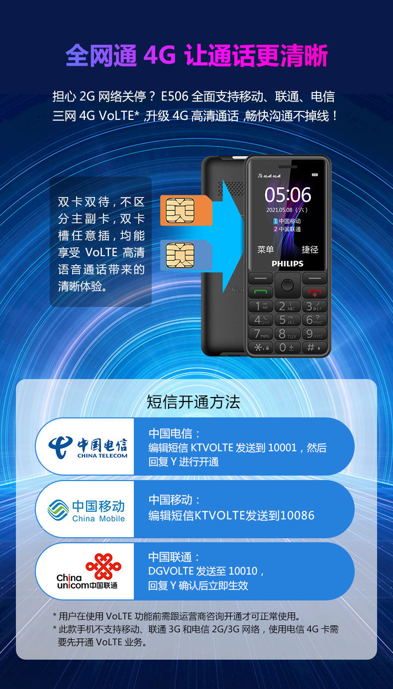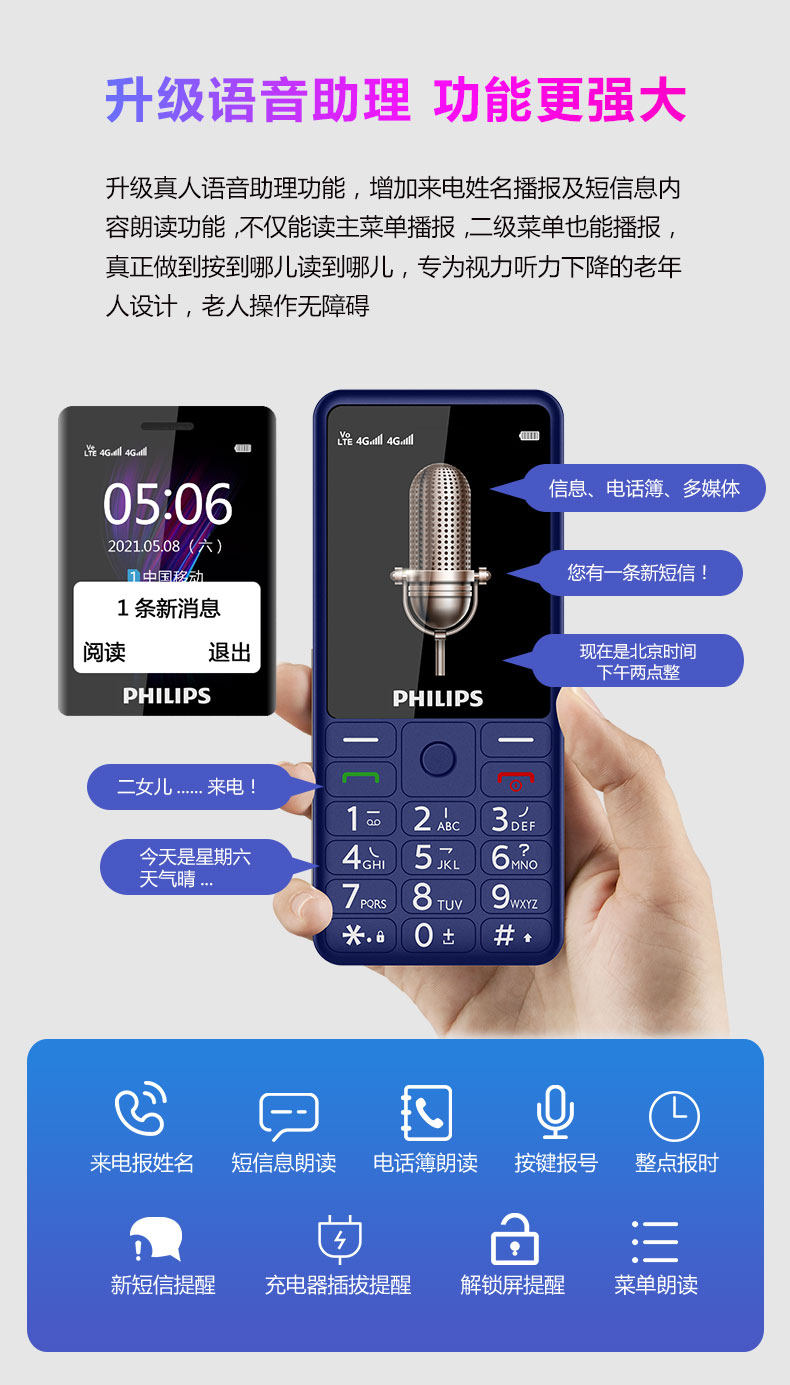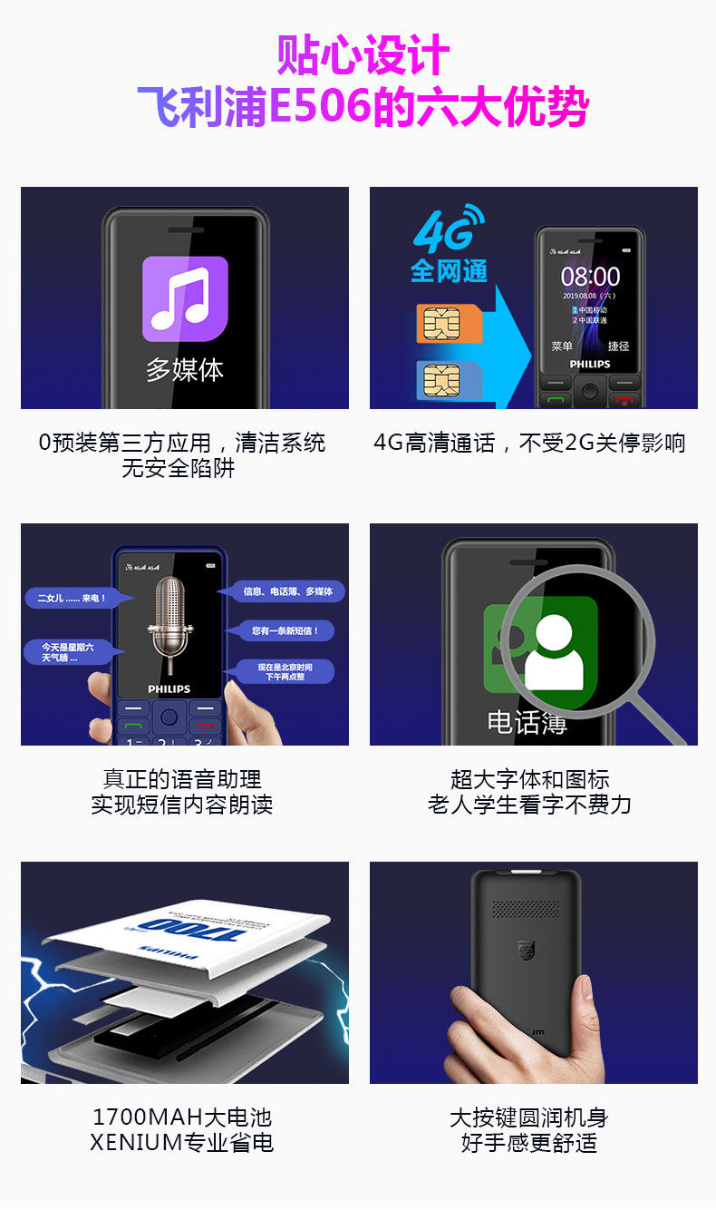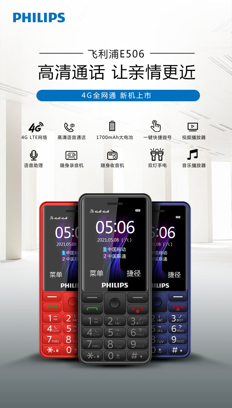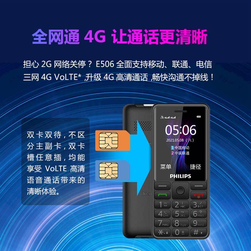 Philips, мобильный телефон для пожилых людей, E506, функция поддержки всех сетевых стандартов связи, 4G