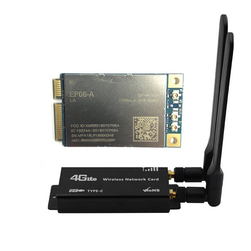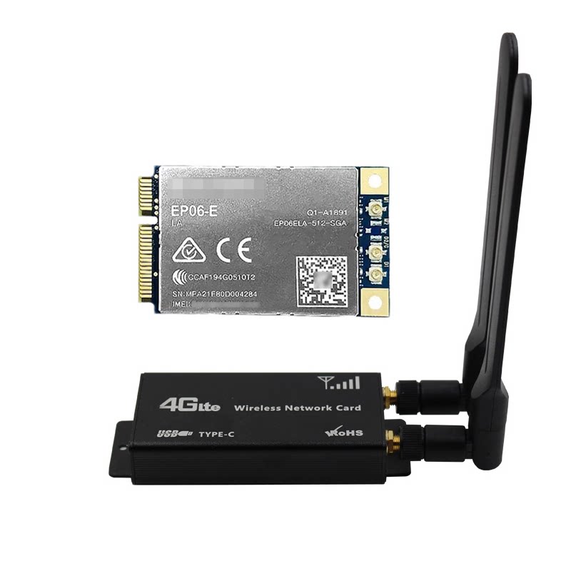 МОДЕМ серии EP06 включает в себя: 1 модуль 4G, 2 всенаправленные антенны 4G, 1 кабель для передачи данных, 2 кабеля антенного адаптера, 1 комплект корпуса и 1 плату адаптера USB MINIPCIE на TYP-C.