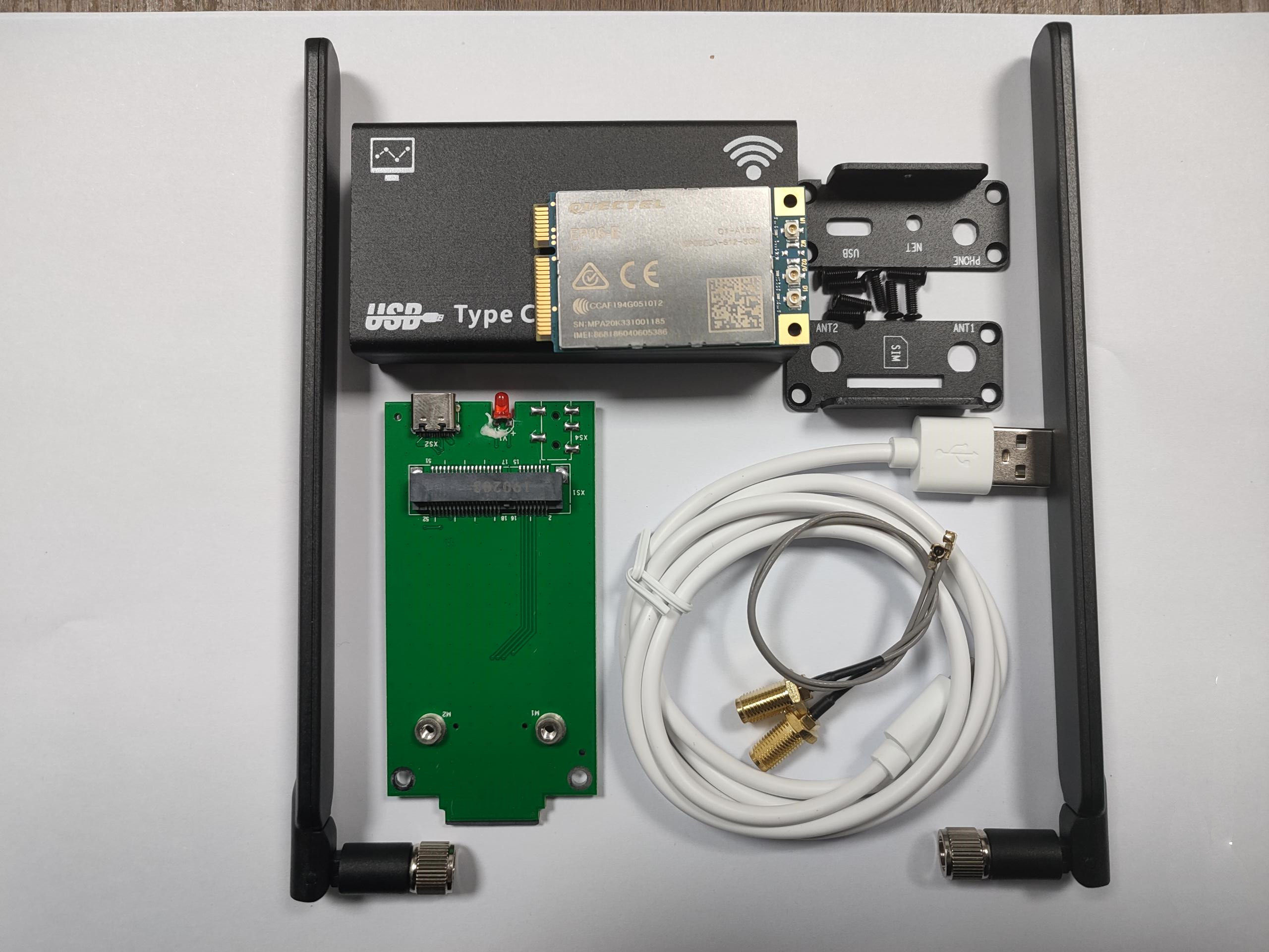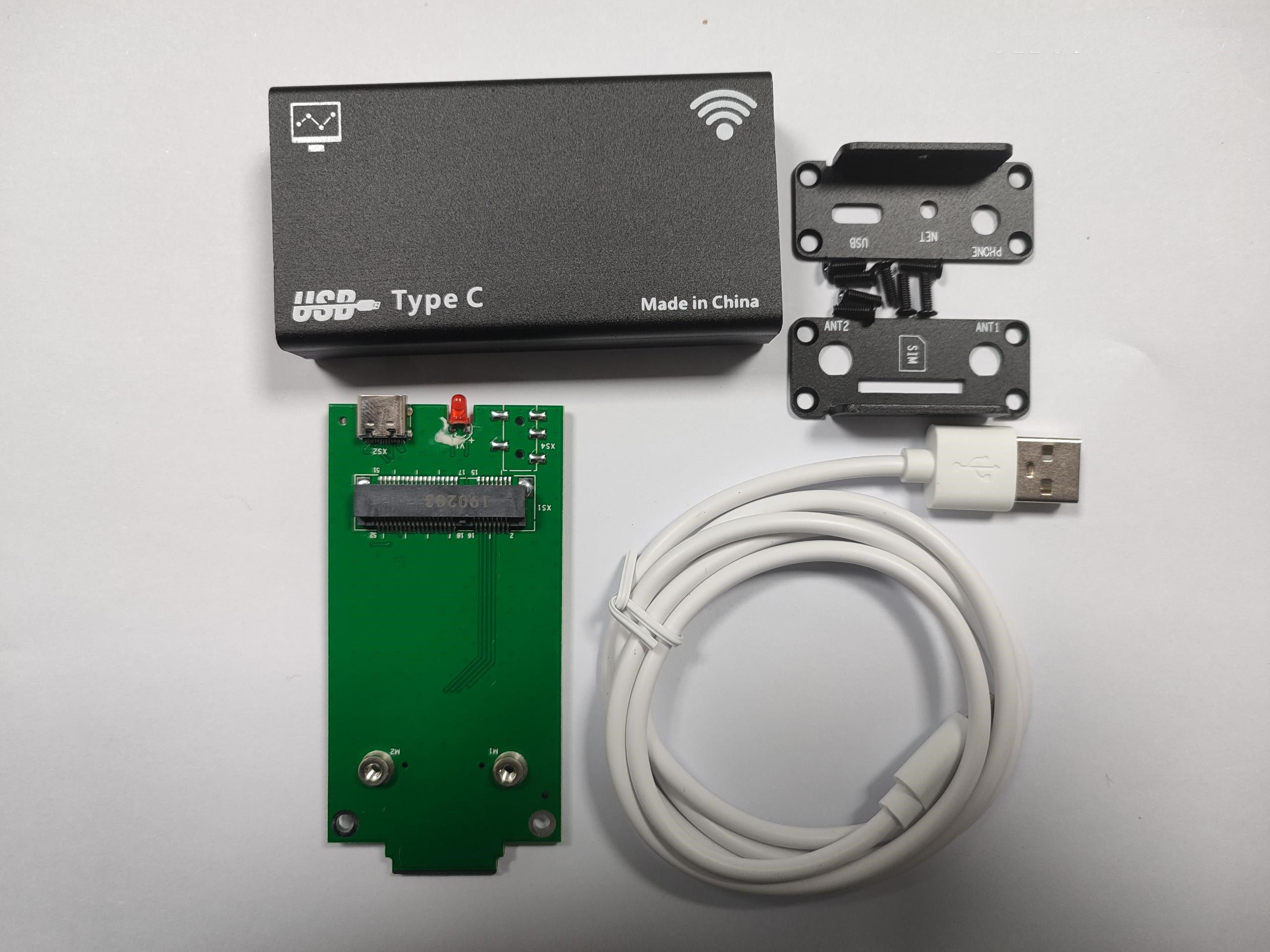 В комплект корпуса МОДЕМА входят: 1 кабель для передачи данных, 1 плата адаптера USB MINIPCIE на TYP-C (применимо к модулям 3G 4G с интерфейсами MINIPCIE, такими как Quectel, SIMCOM, Fibocom, MeiG, Huawei, Youfang и т. д.)