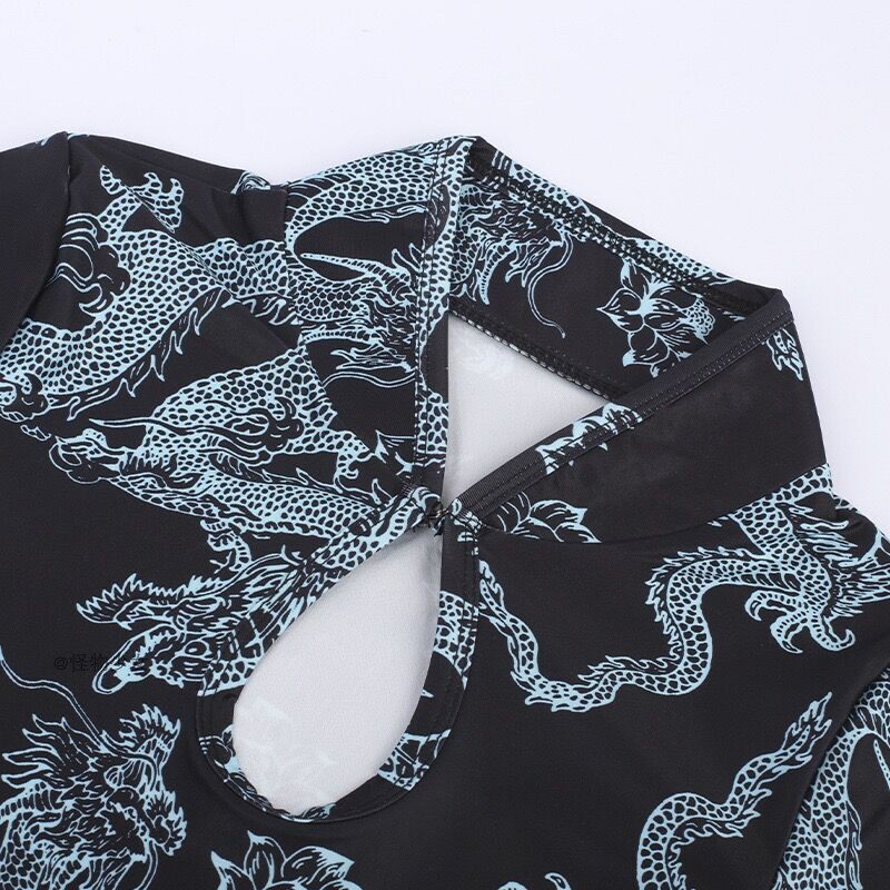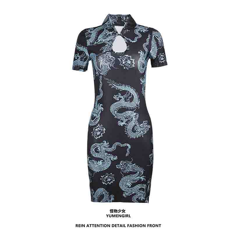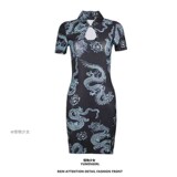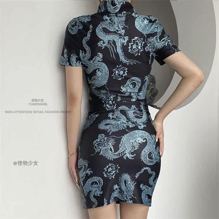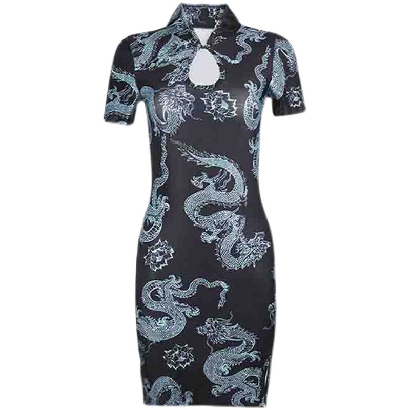 Ретро ципао, принт, короткий рукав, с рукавом