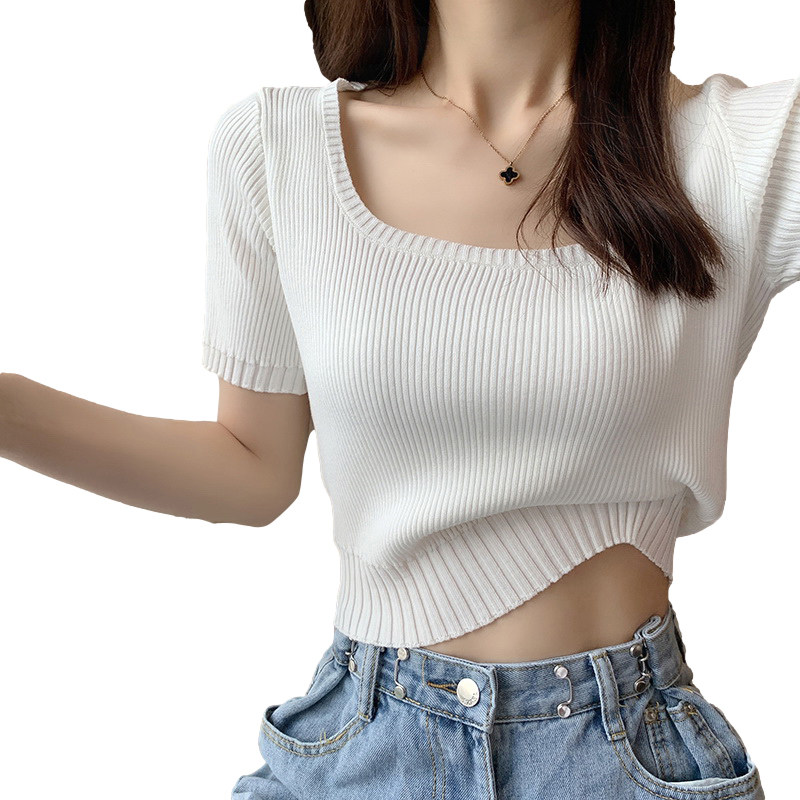 Белая летняя короткая дизайнерская трикотажная модная футболка, квадратный вырез, тренд сезона