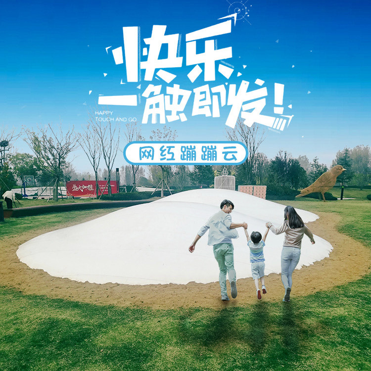 На открытом воздухе большая сеть знаменитостей прыгает облачная живописная пятно, песчаная трава, надувные для прыжков, дети, прыгающие в облачном парке, производители