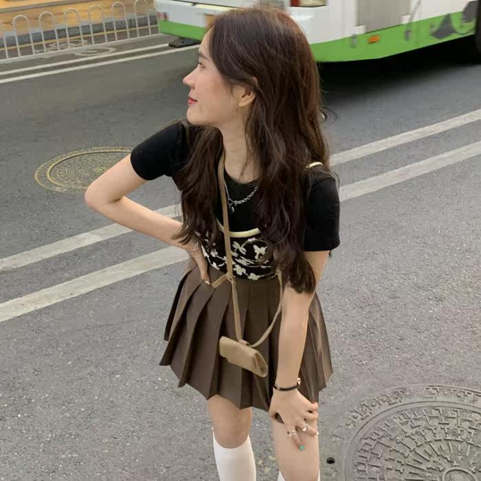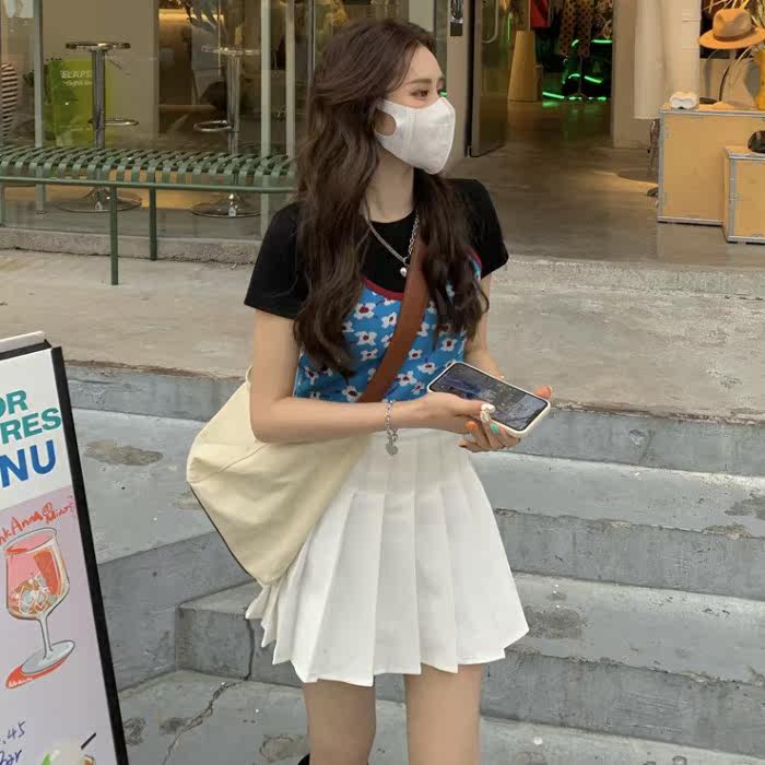 Ретро синий комплект, трикотажный жилет, майка, универсальная футболка с коротким рукавом, юбка в складку, эффект подтяжки, высокая талия