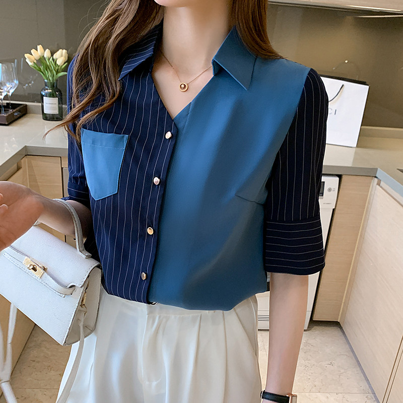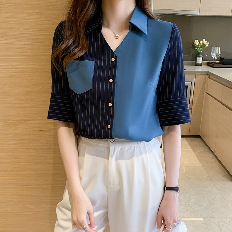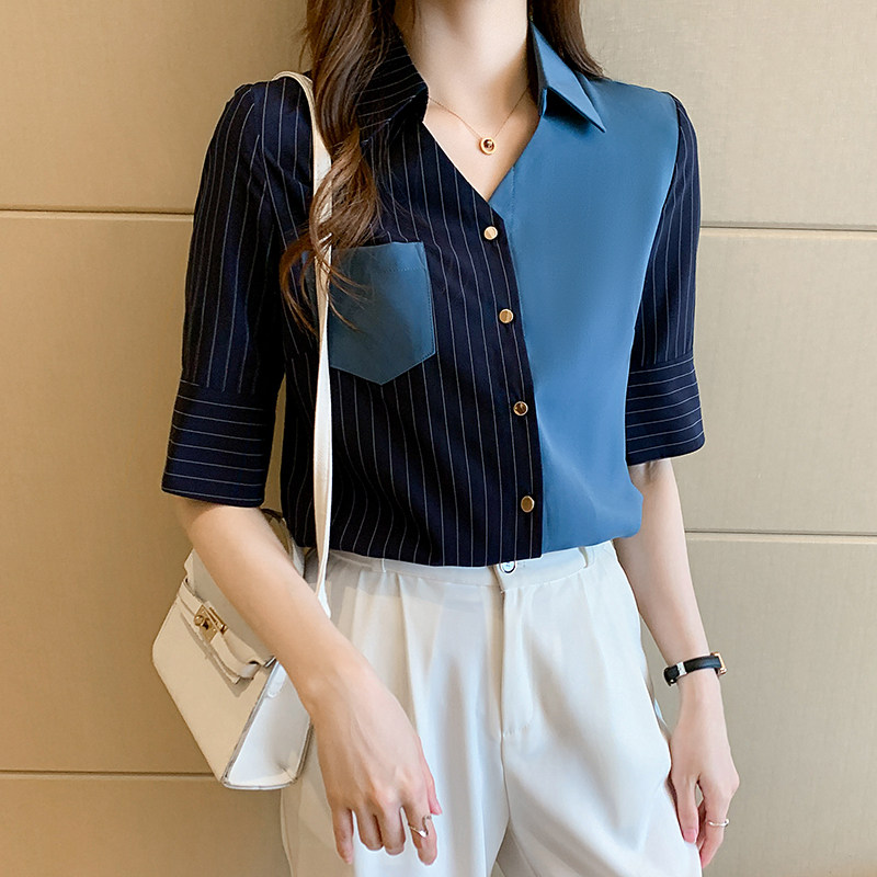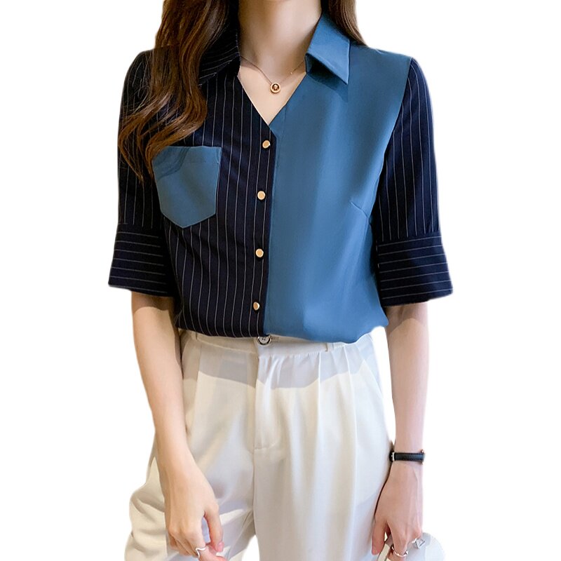 Драпированная шифоновая рубашка в вертикальную полоску, дизайнерская ниша на рабочем месте, легкая женская одежда в зрелом стиле, офисные работники носят топы с короткими рукавами