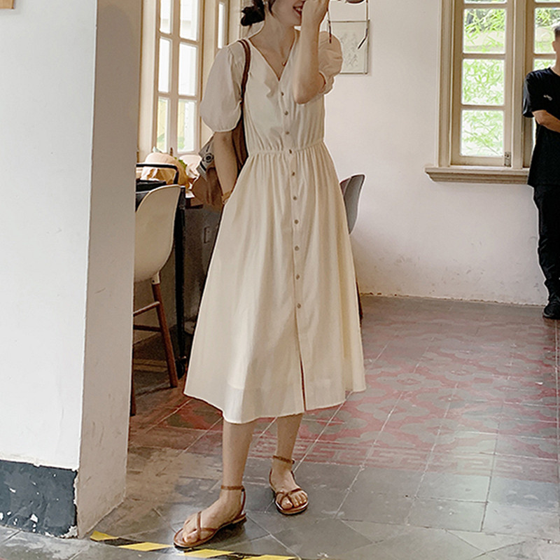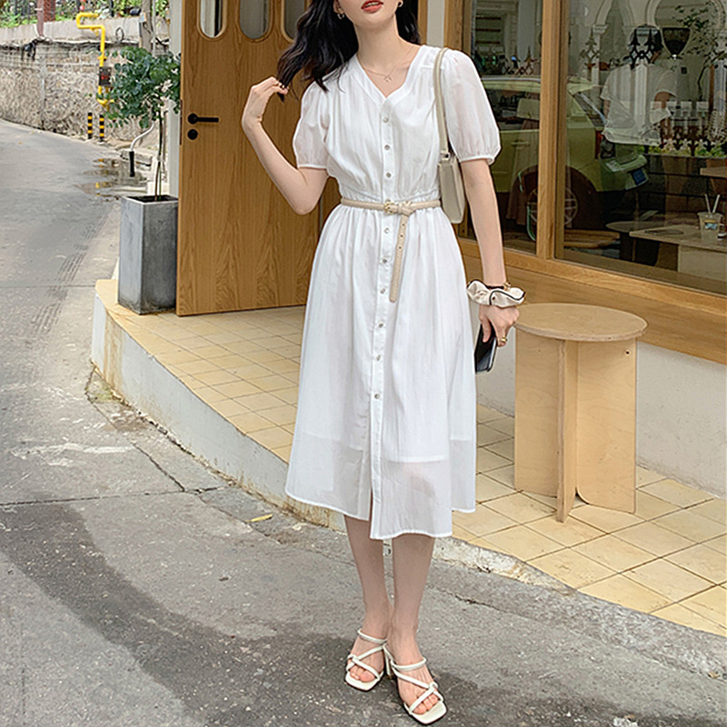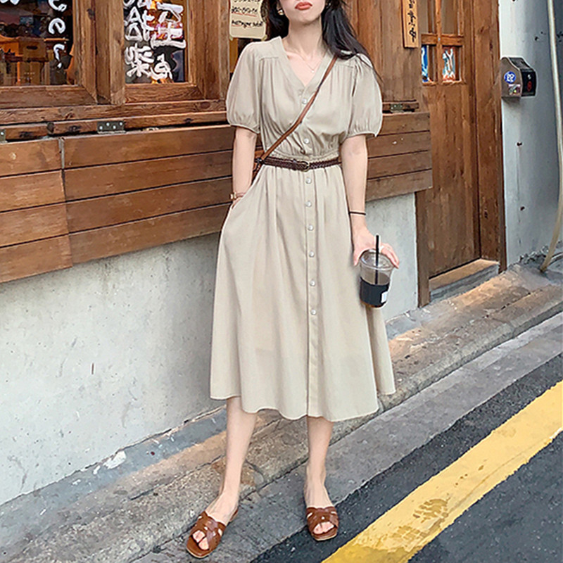 Летнее платье, юбка, приталенный длинный корсет, V-образный вырез, высокий воротник, короткий рукав, с рукавом